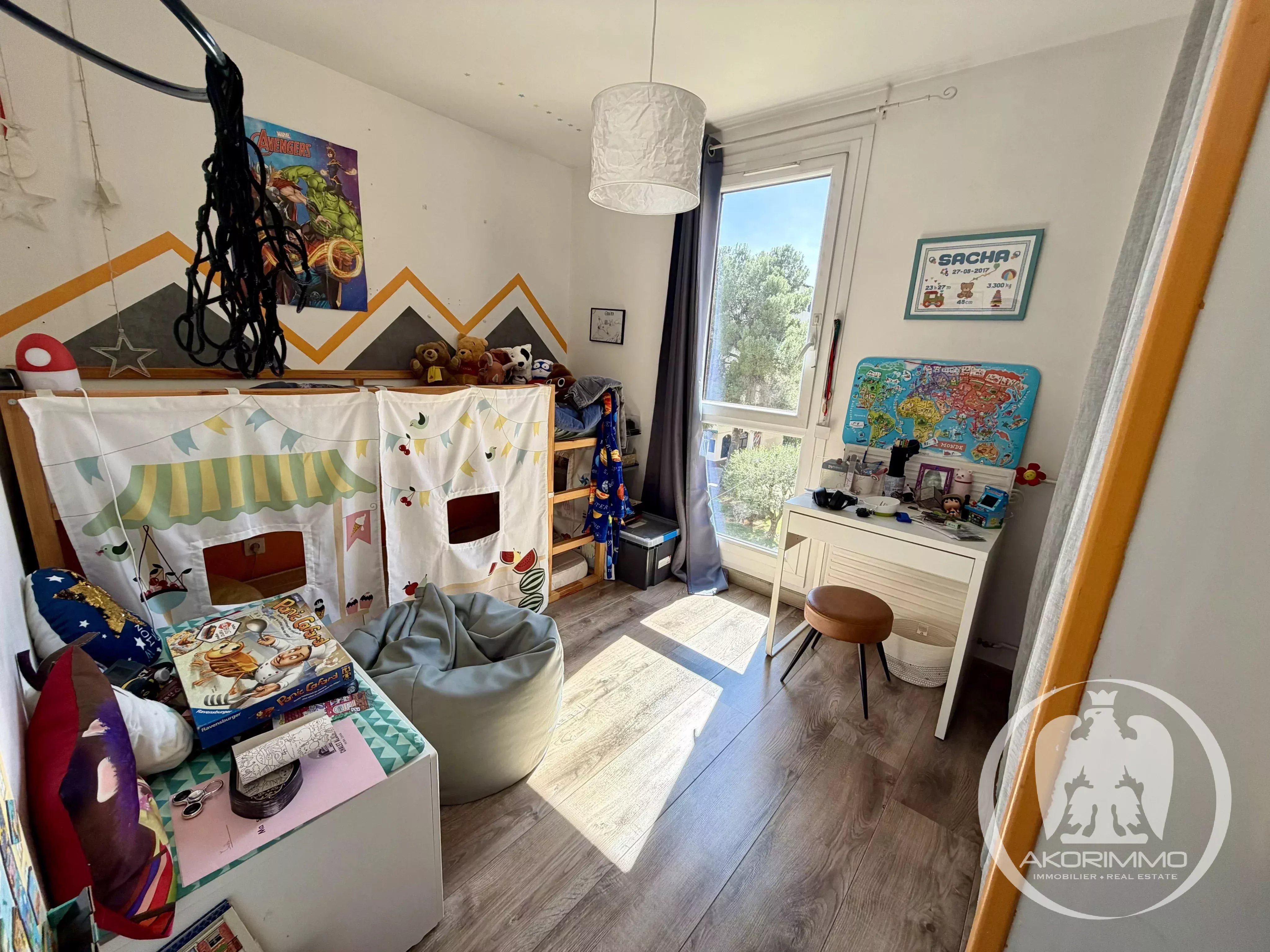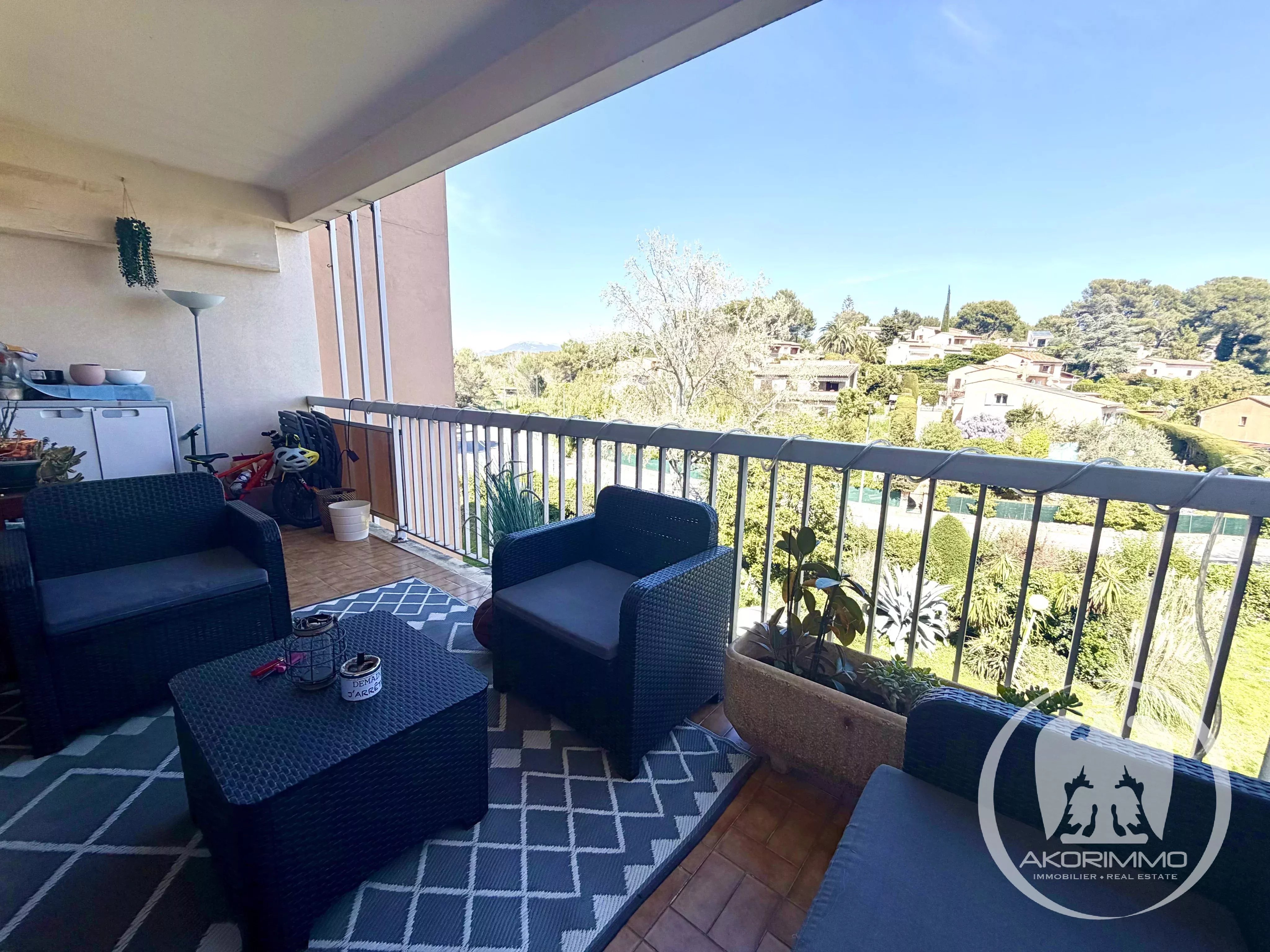 In the family-friendly Semboules neighborhood, at the gateway to Sophia Antipolis, is this magnificent five-room apartment. This unit features a high-floor terrace, dual aspect with south-north exposure, and an unobstructed view of greenery and the sea. The apartment has been completely renovated, with an entrance hall and a pantry. A beautiful open kitchen flows into a bright living and dining area. In the sleeping quarters, there are three bedrooms, including a very spacious one, a bathroom, a separate toilet, and a laundry room. There's the possibility to create a fourth bedroom. A private parking space adds to its comfort. Plenty of guest parking. Secure residence with a caretaker. Low service charges.