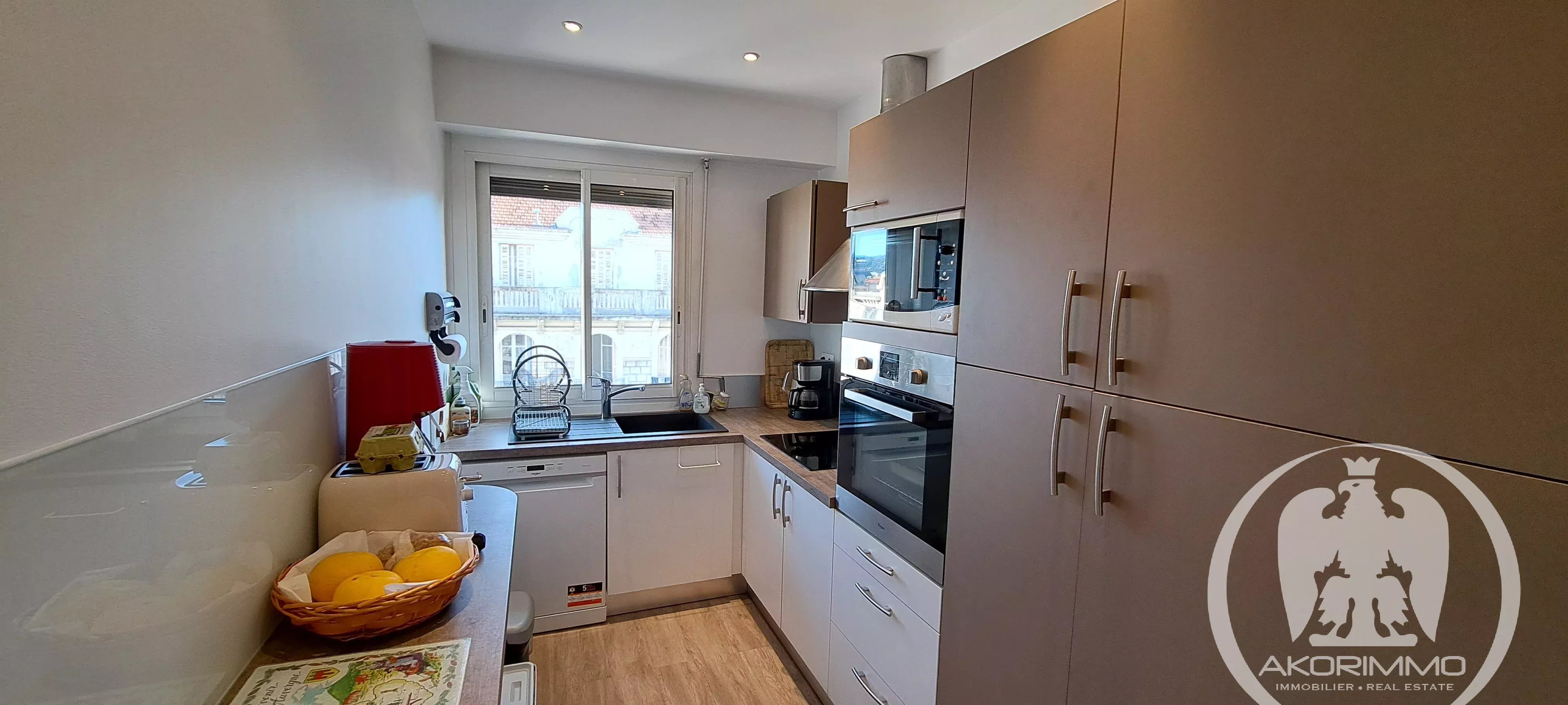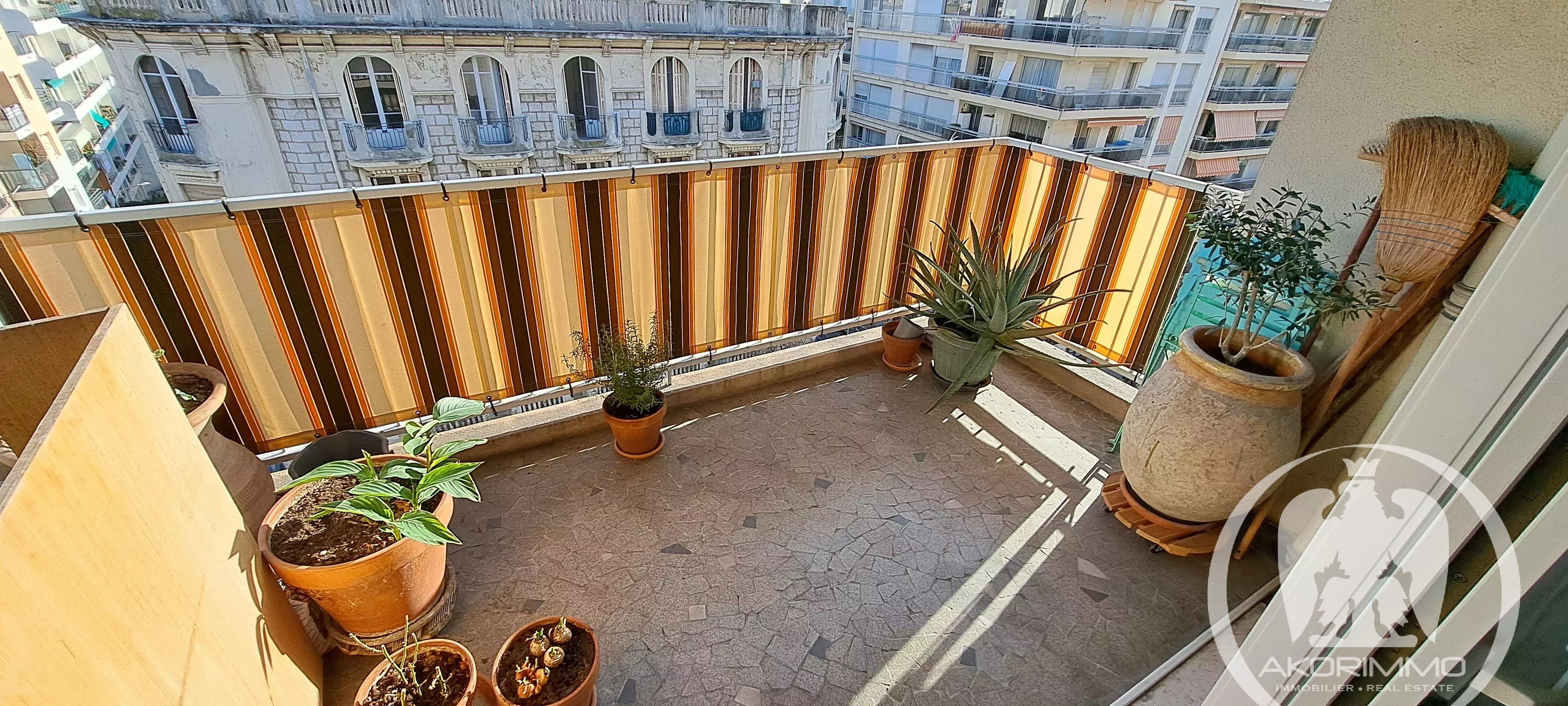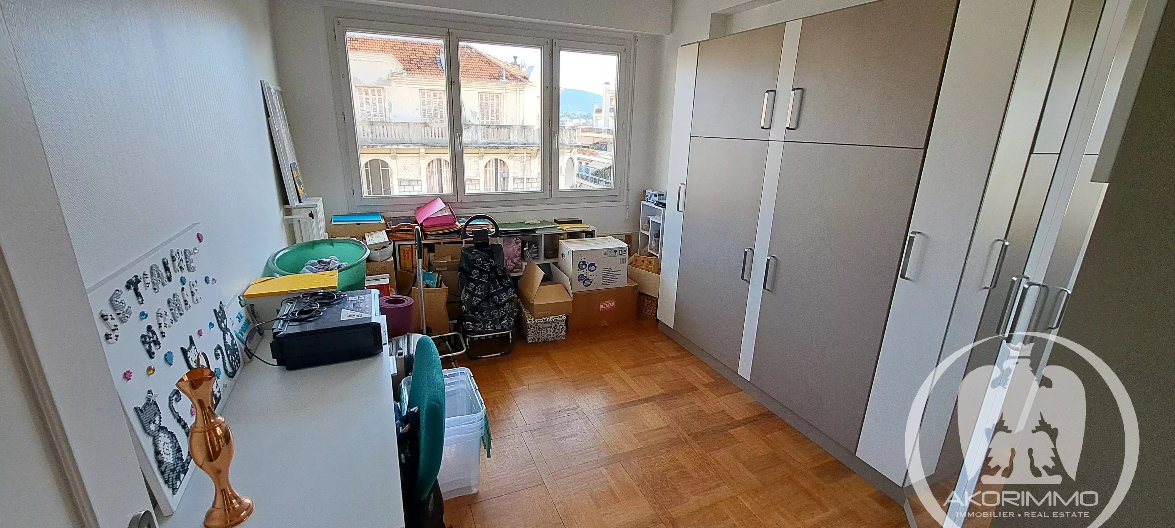 Three-room apartment in perfect condition, located on the 6th and second-to-last floor with elevator, unique east-facing exposure. Comprising an entrance with closet, a living room with a 6 m² terrace, an independent kitchen (open-plan possible), two beautiful bedrooms with hardwood floors, a shower room, and a separate toilet. Cellar and garage in the basement.