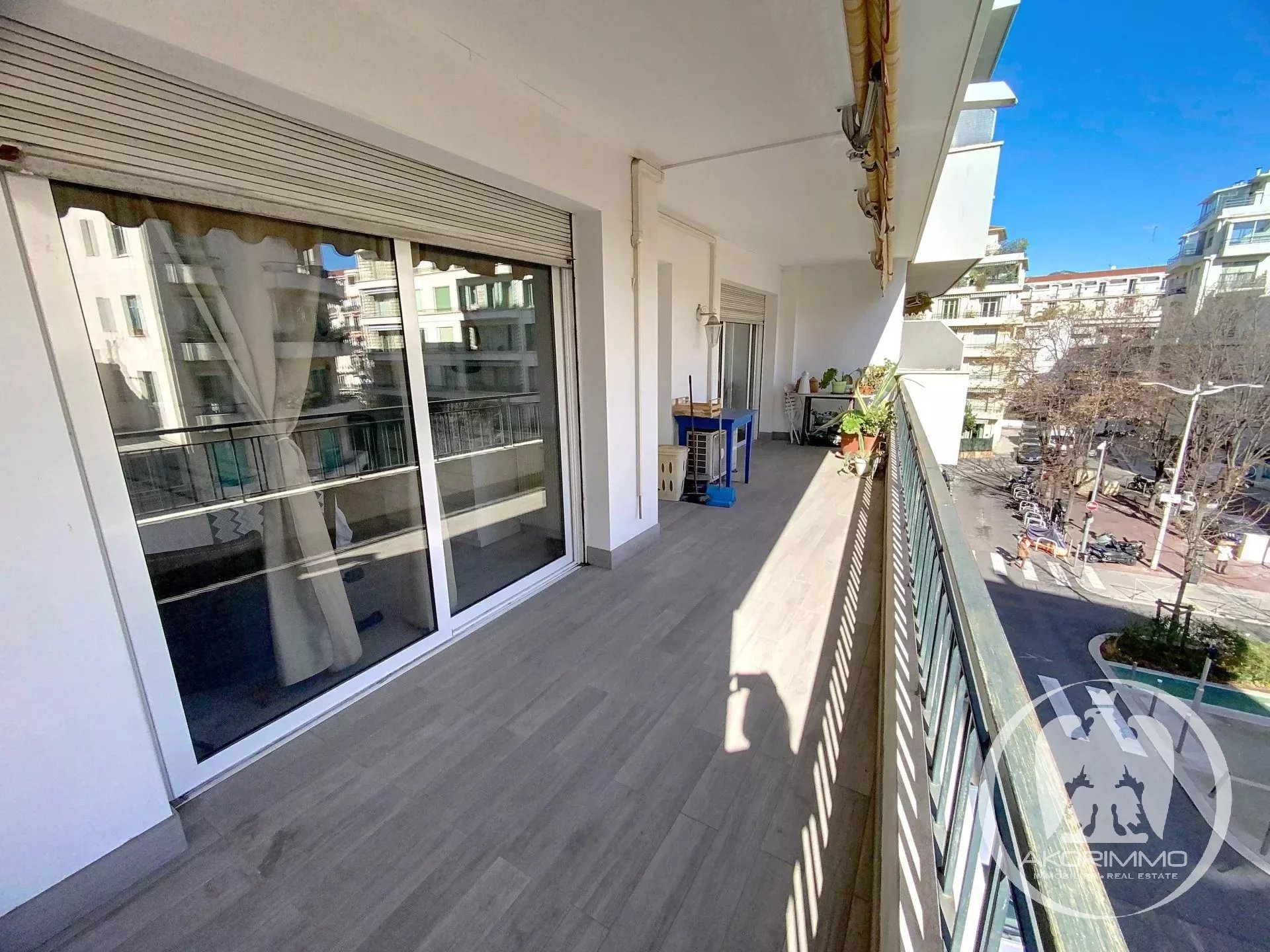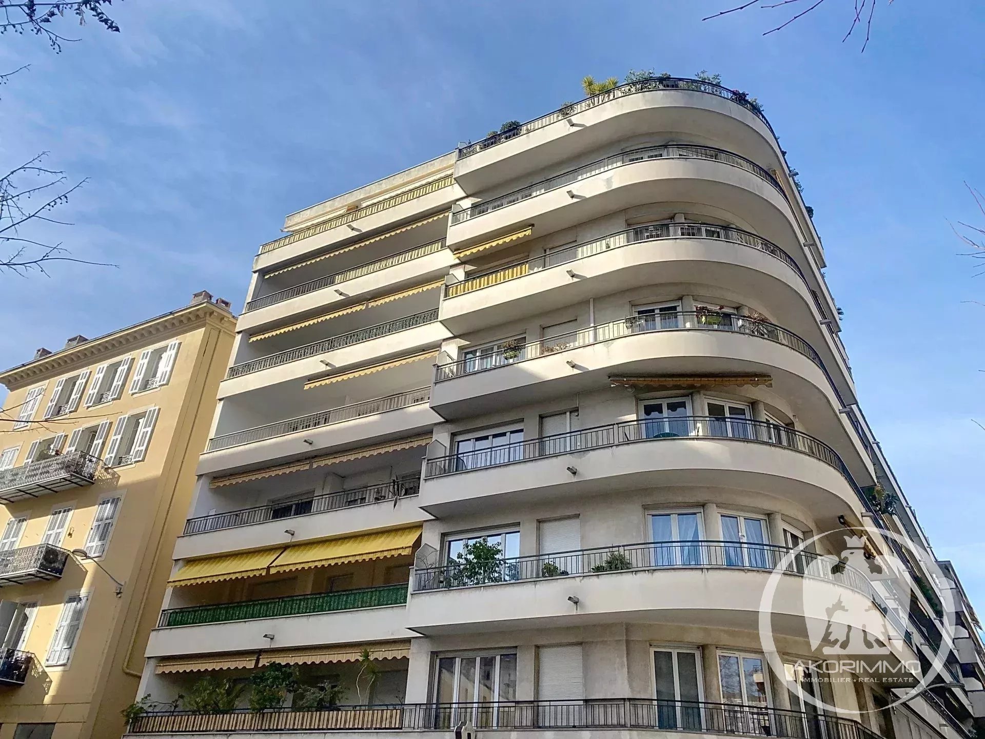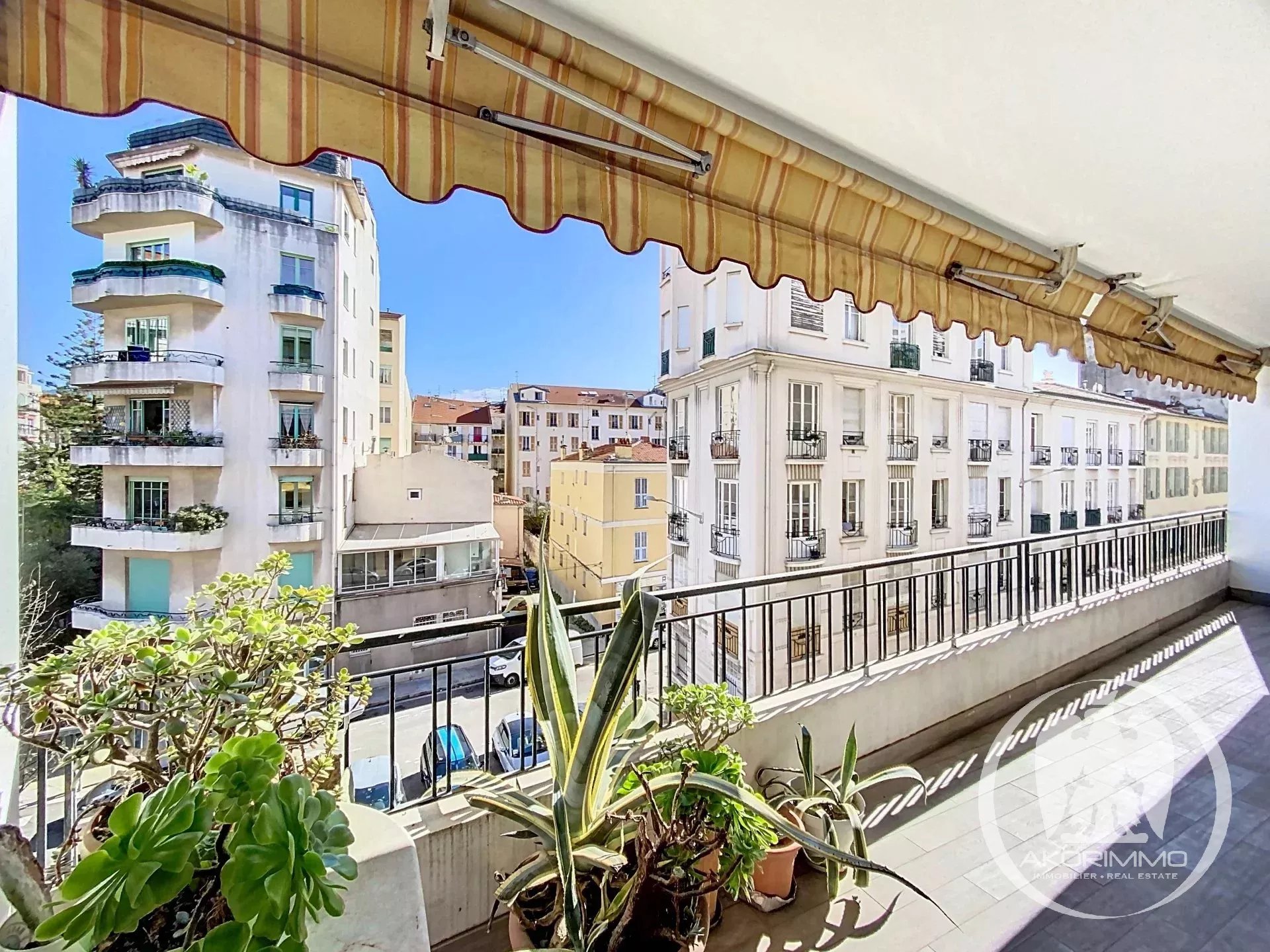 Beautiful, comfortable and quiet apartment, located on the 3rd floor of a stunning Art Deco building, in the heart of the Fleurs district, just steps from the sea, shops, restaurants, and the Alsace-Lorraine tram stop. The apartment consists of an entrance hall with built-in closet, a living room with a fully equipped semi-open kitchen, a large bedroom, a second bedroom/office, and a bathroom with toilet. Option to create a second toilet. The living room, kitchen, and master bedroom open onto the large east-facing terrace.
