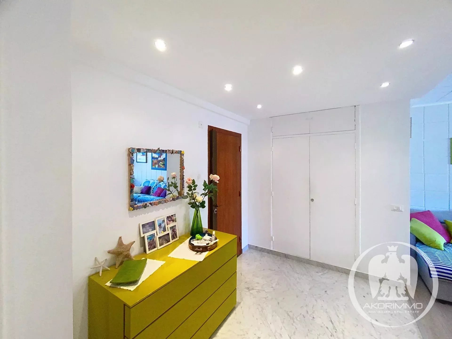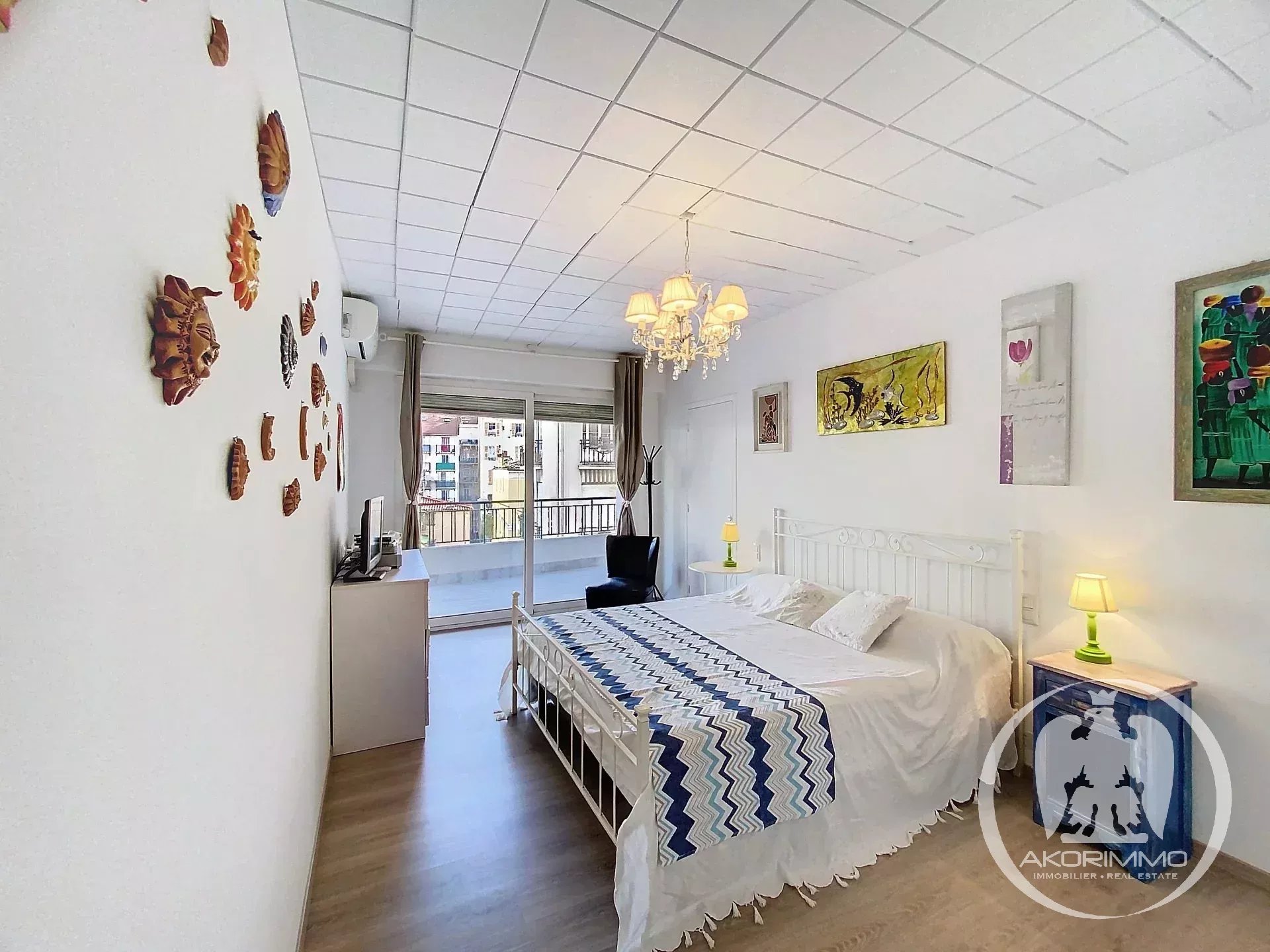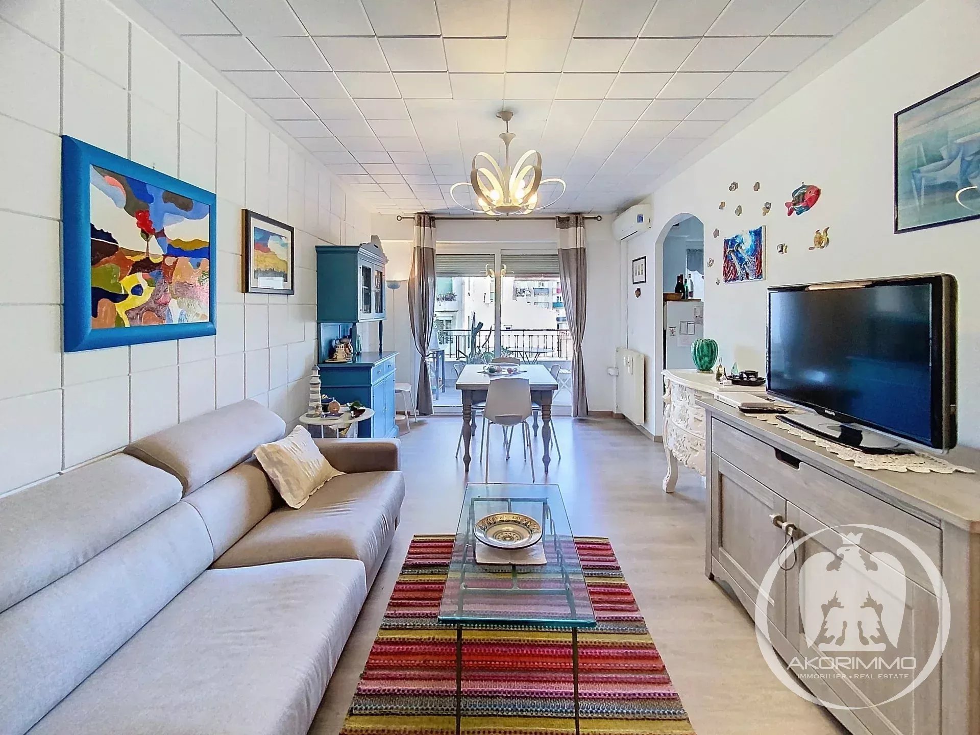 Beautiful, comfortable and quiet apartment, located on the 3rd floor of a stunning Art Deco building, in the heart of the Fleurs district, just steps from the sea, shops, restaurants, and the Alsace-Lorraine tram stop. The apartment consists of an entrance hall with built-in closet, a living room with a fully equipped semi-open kitchen, a large bedroom, a second bedroom/office, and a bathroom with toilet. Option to create a second toilet. The living room, kitchen, and master bedroom open onto the large east-facing terrace.