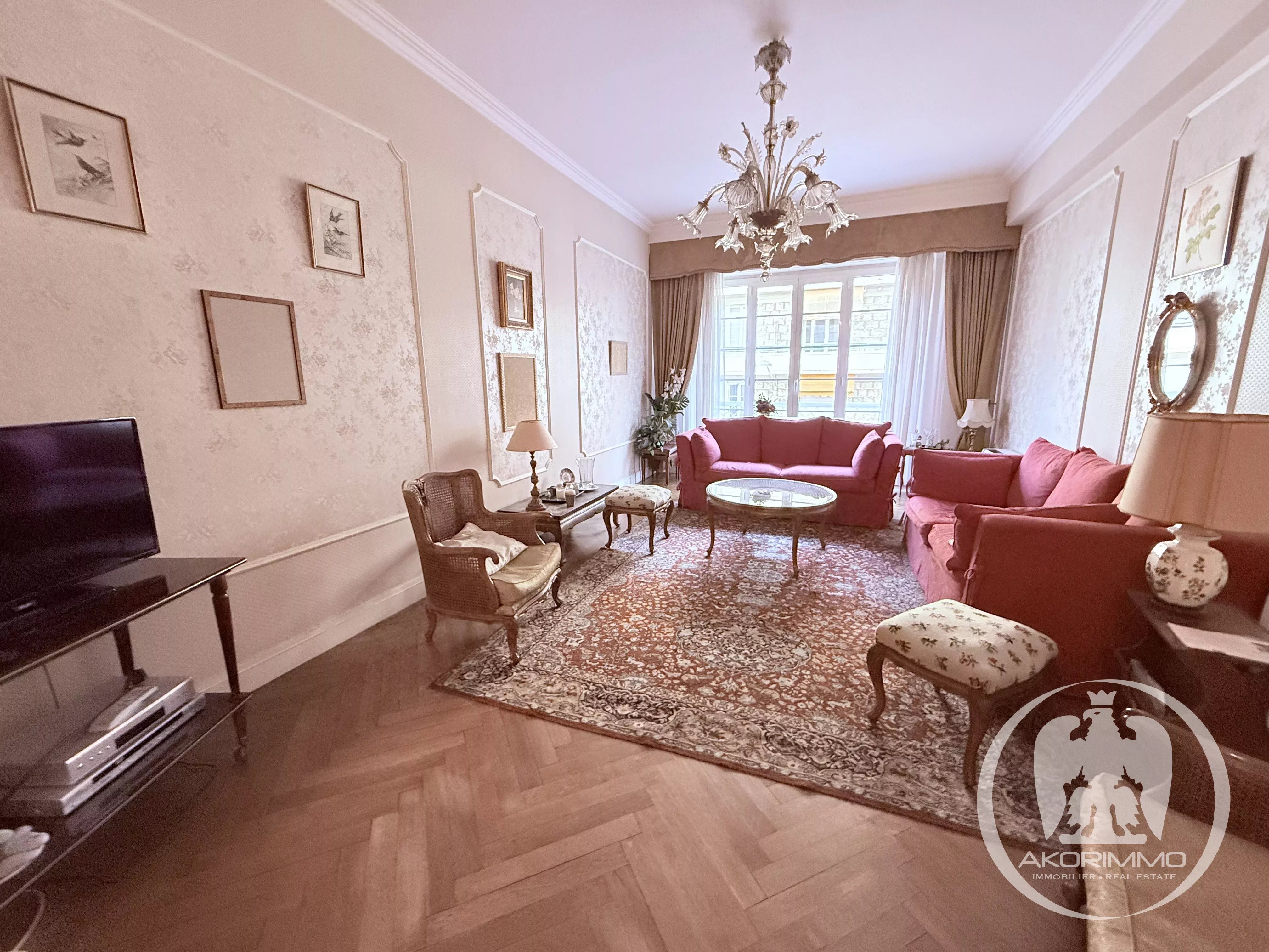 The apartment consists of a 39 sqm living room, two large bedrooms of 17 sqm and 15 sqm, a fully equipped separate kitchen, a recent bathroom, storage spaces, and two toilets.