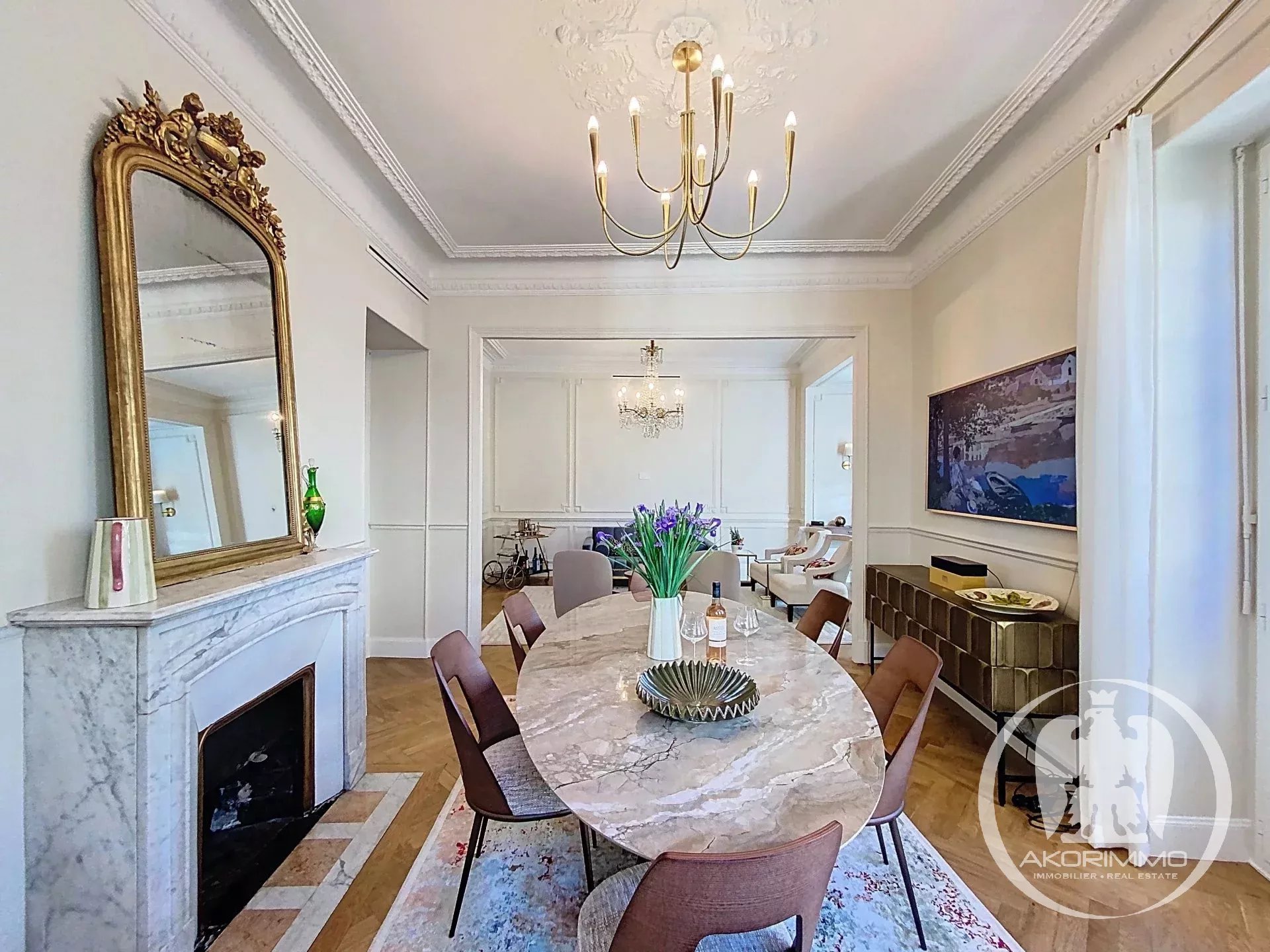 The renovation, completed in December 2025, was carried out with absolute respect for the original features: MOULDINGS, FOUR marble fireplaces, Hungarian Point parquet, and exceptional ceiling heights.