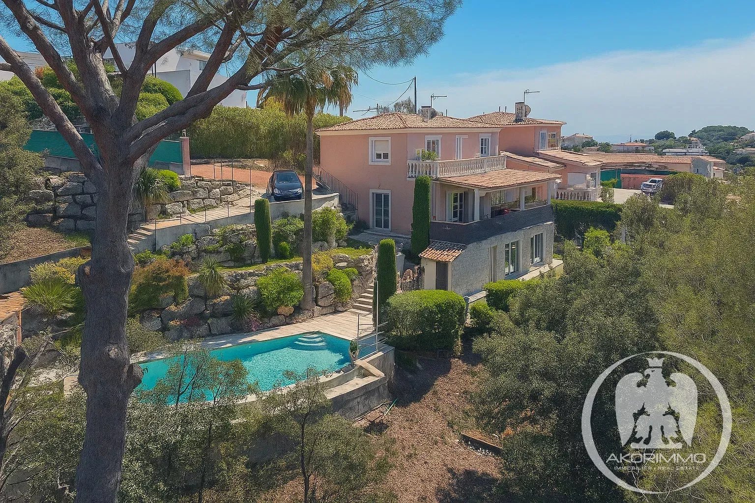 Outdoors, the property covers a total of 2,500 m², including approximately 1,700 m² of terraced and natural area. On the landscaped 800 m² section, in addition to the house, there are beautiful terraces, a large, fully equipped covered summer kitchen, and a gorgeous infinity pool treated with a salt chlorinator.