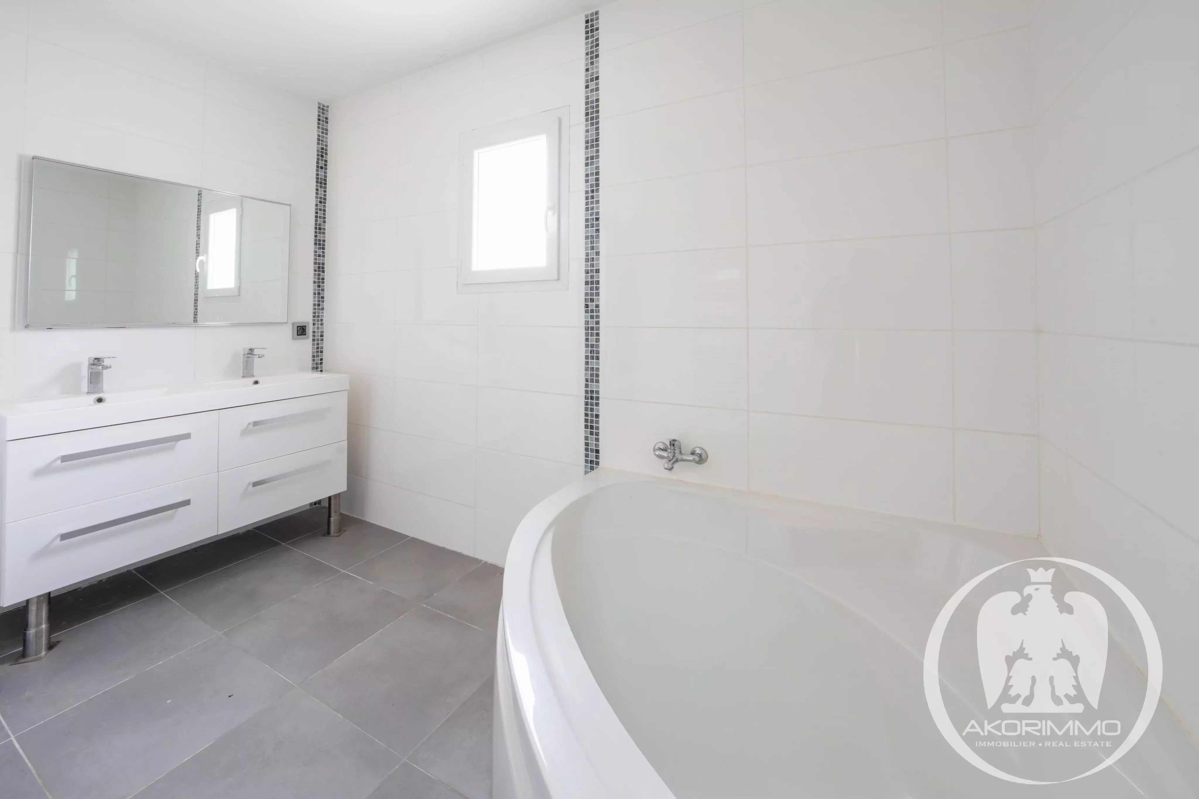 The villa features a spacious, bright living room opening onto a beautiful terrace, a fully equipped kitchen, several spacious bedrooms, and a modern bathroom.