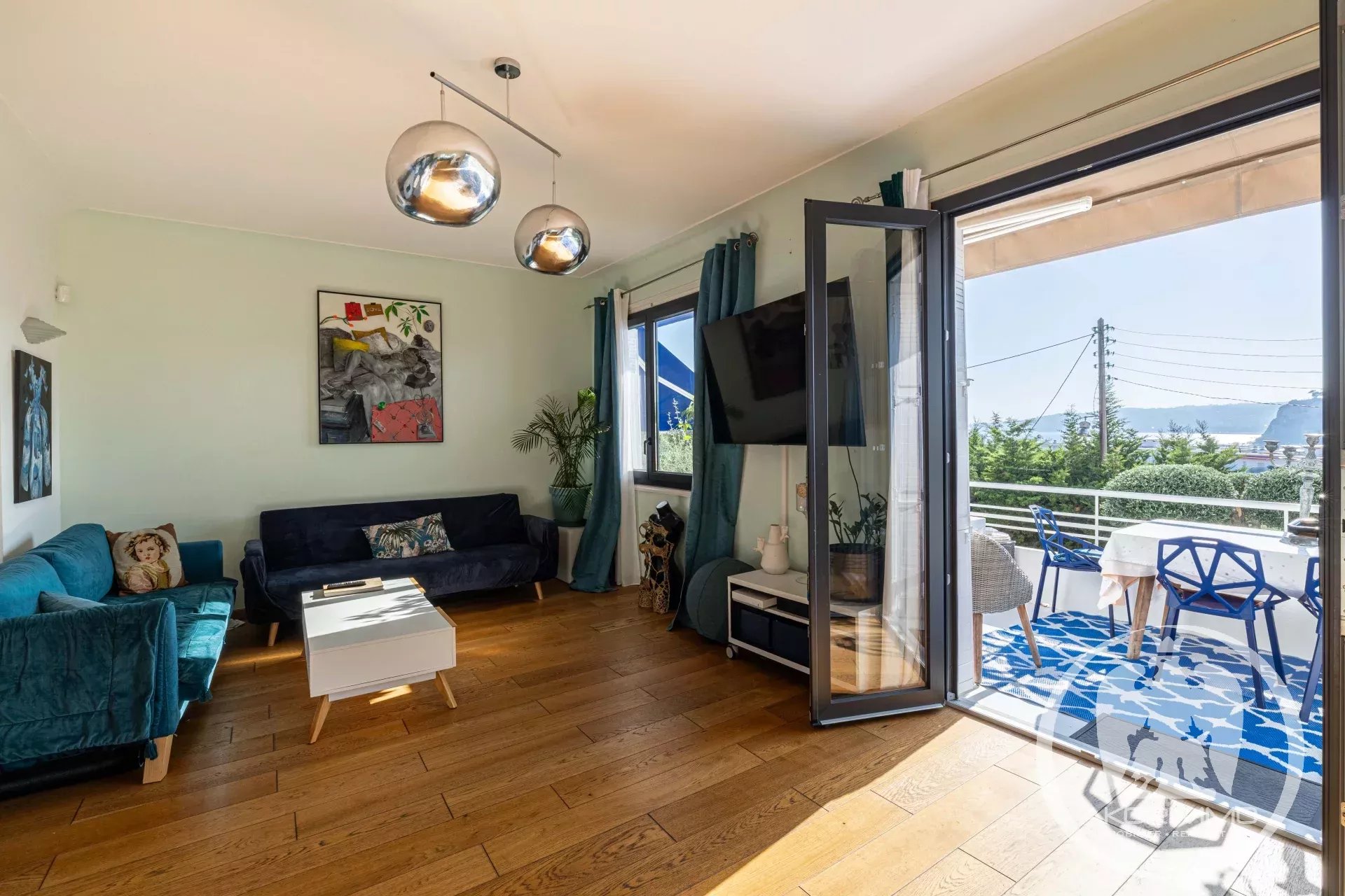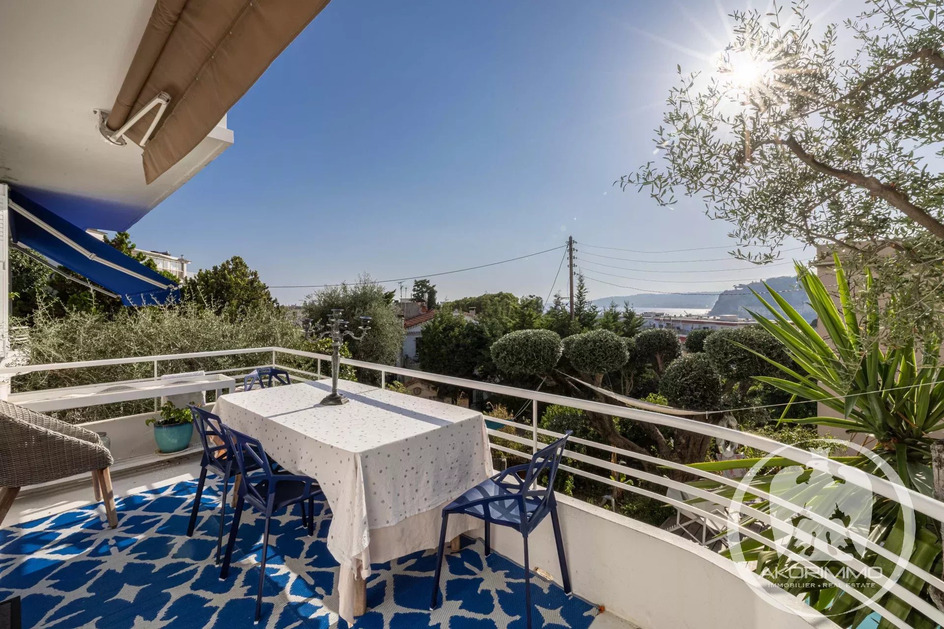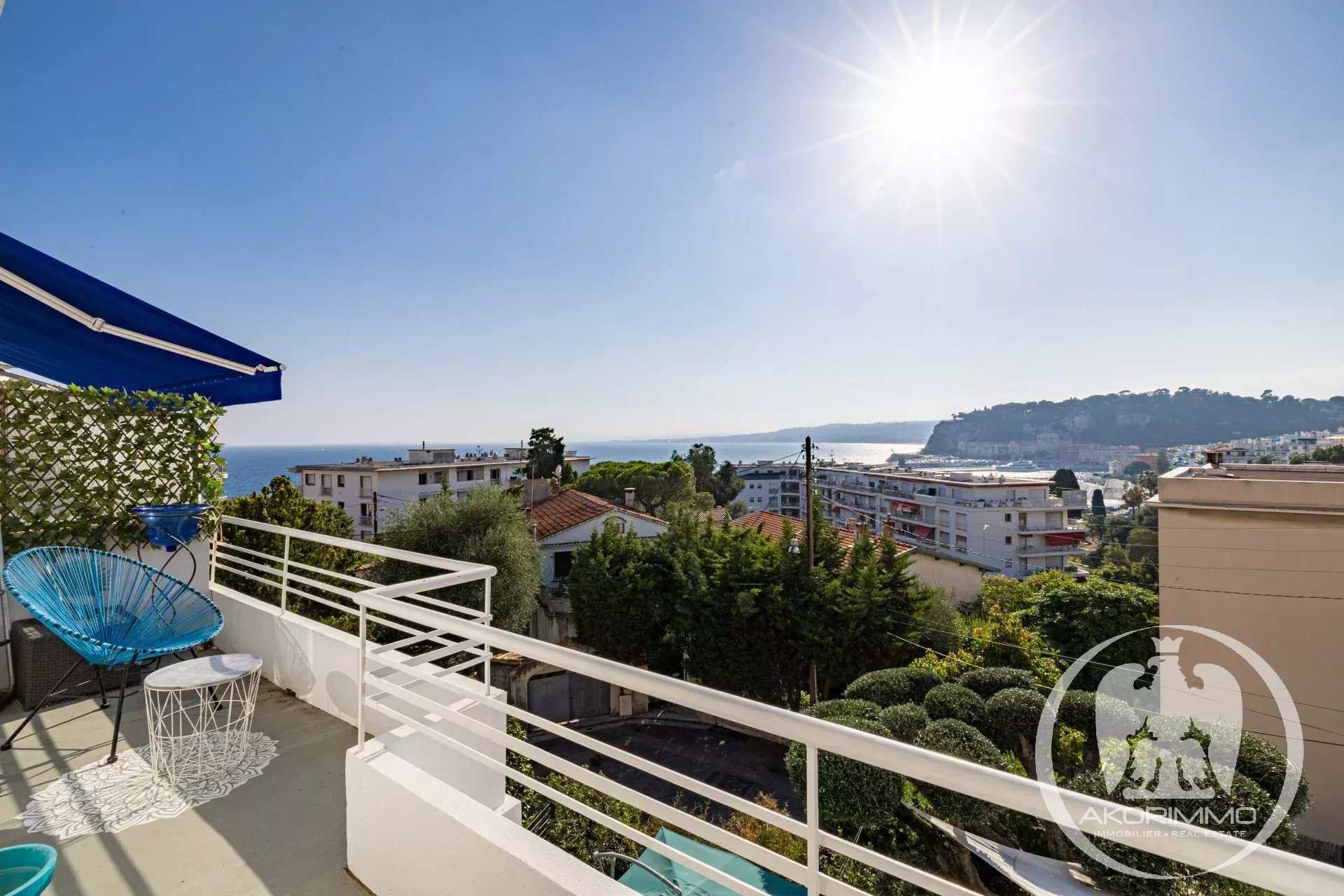 The property features a bright living room with dining area and a kitchen opening onto a lovely terrace offering sea and city views.