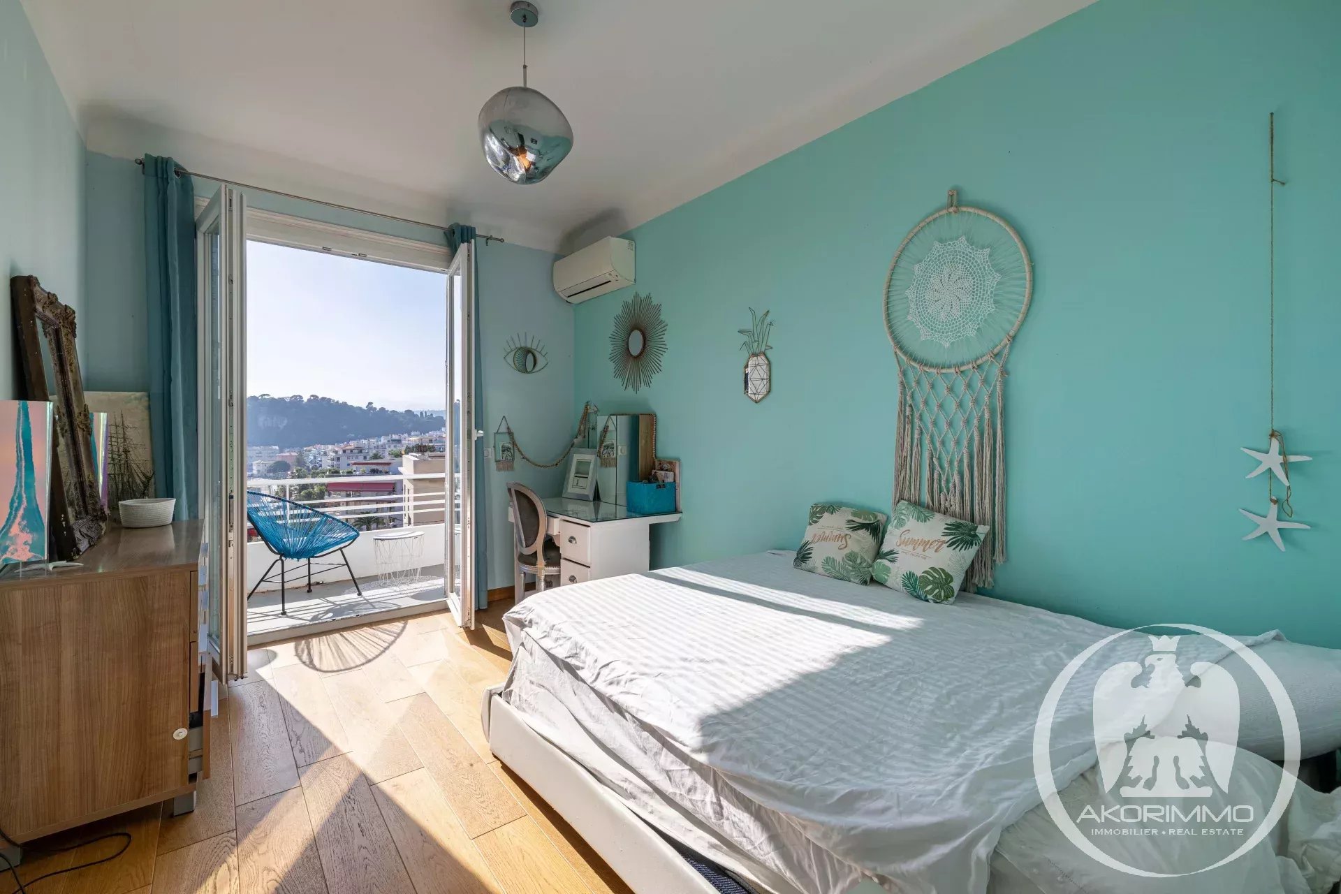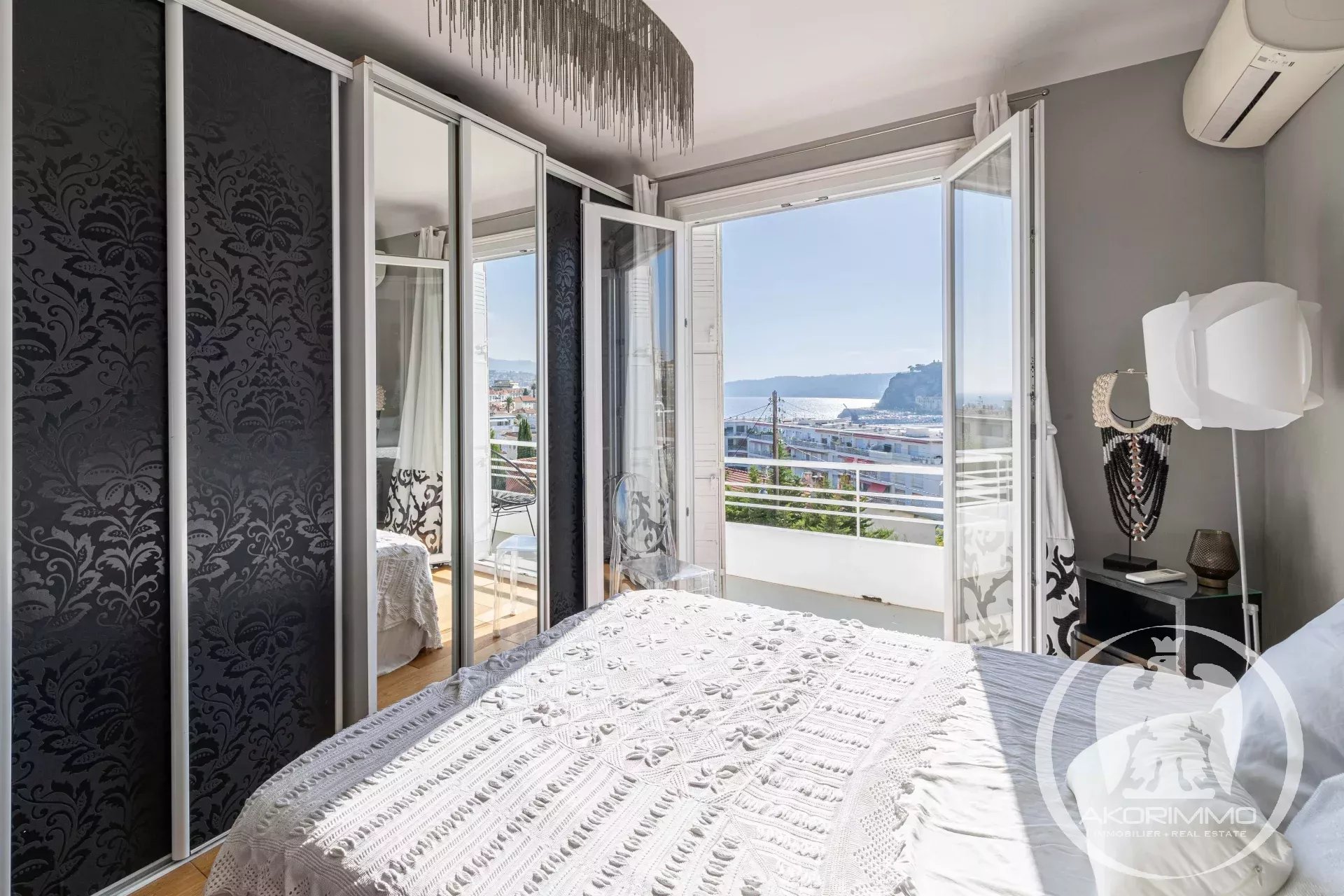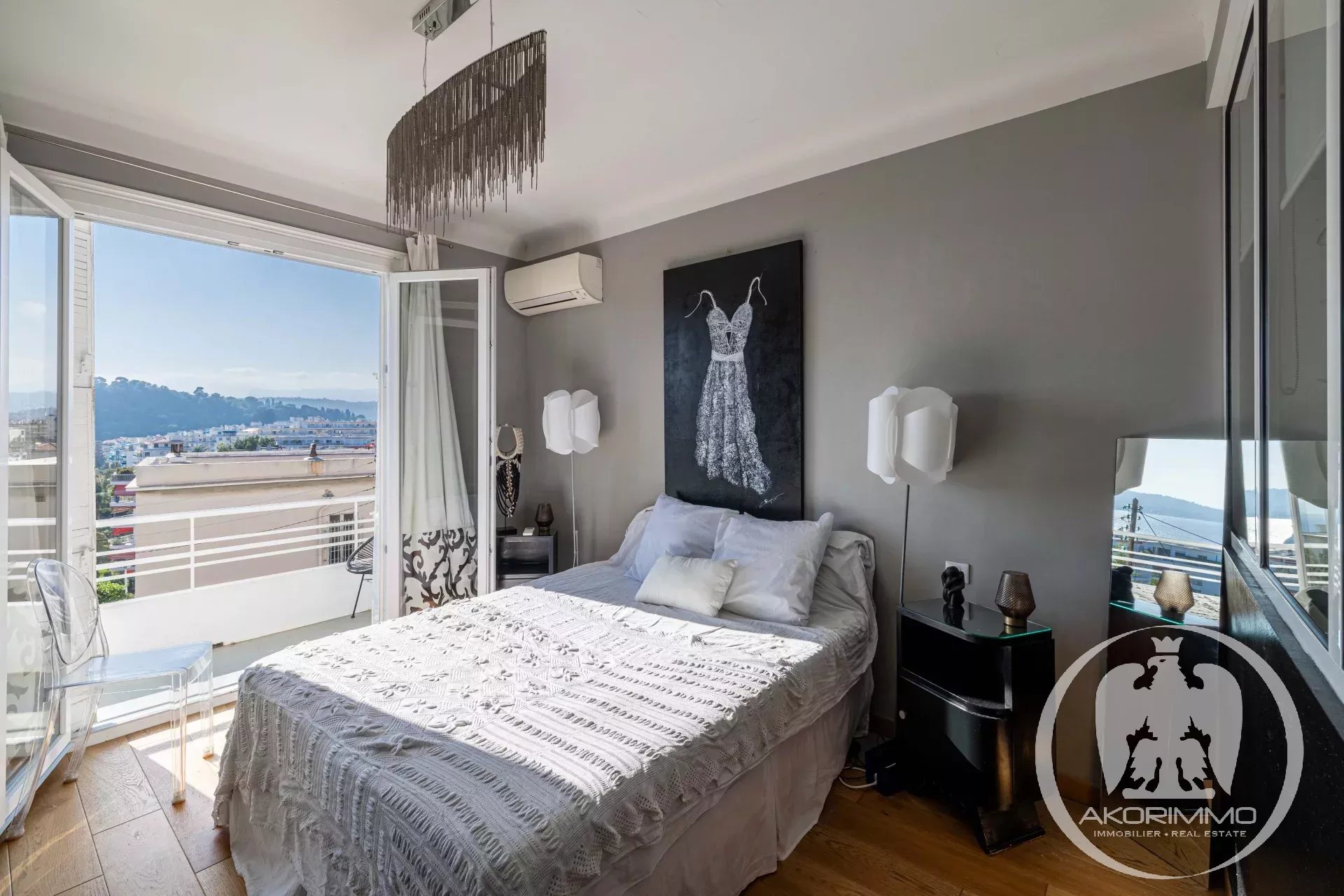 On the mezzanine level, there is a first bedroom or office, while the upper floor offers two spacious bedrooms enjoying a magnificent panoramic view of the sea, the port, and the city, both opening onto a balcony. These bedrooms are complemented by two bathrooms with toilets, and a guest toilet completes the main level.