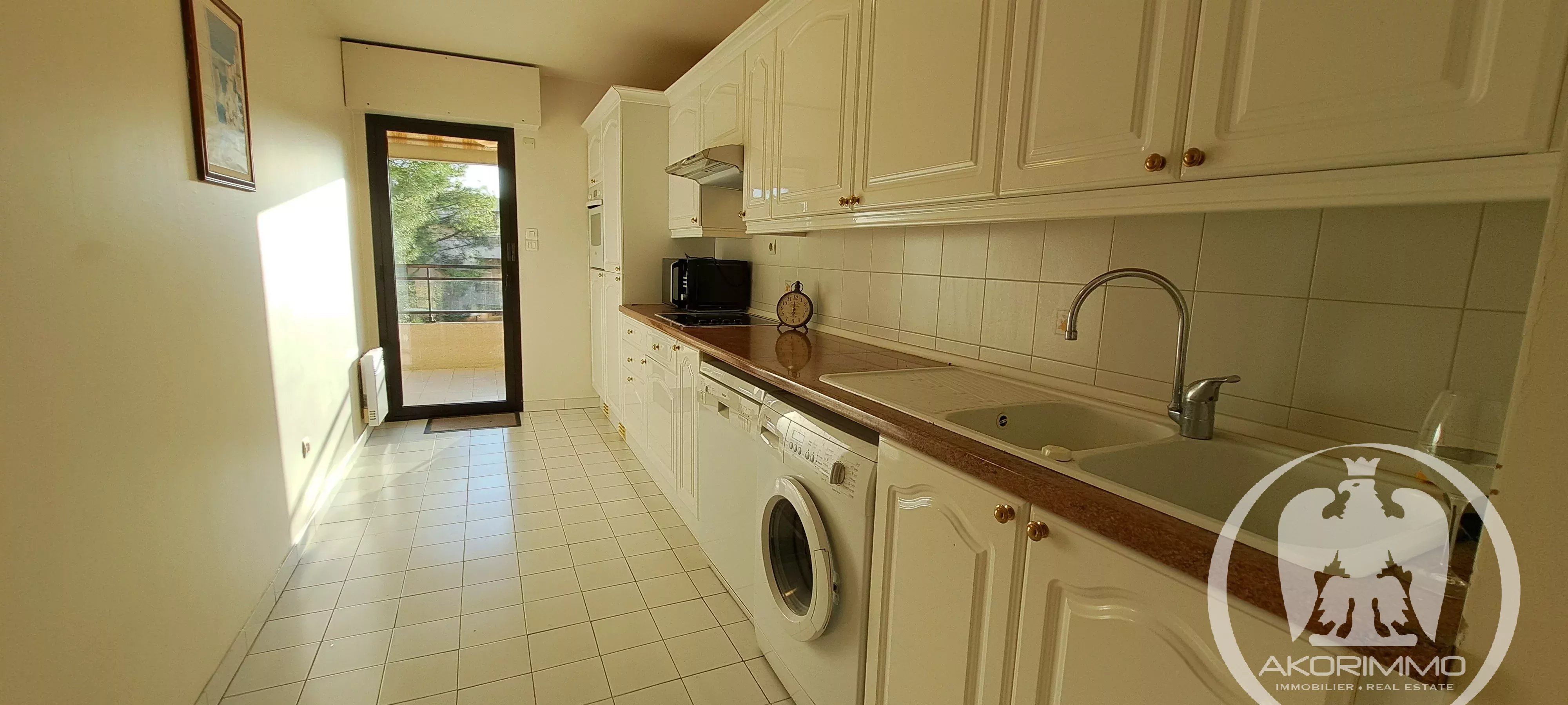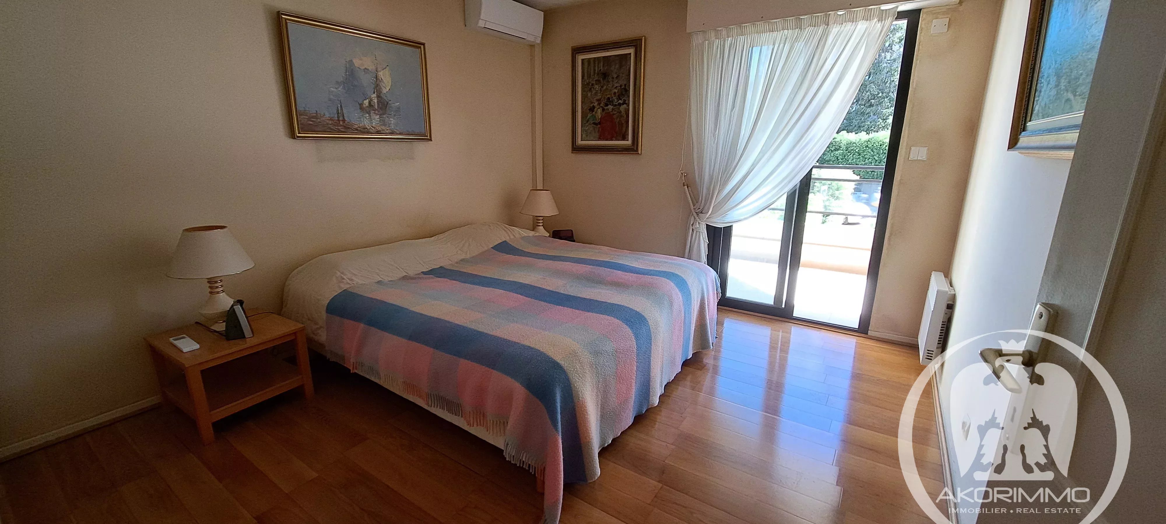 Dans une résidence de standing très bien tenue avec piscine et jardin, grand appartement trois pièces (82 m²) en excellent état, traversant, entièrement climatisé. Composé d'une entrée avec placard, d'un beau séjour sur lequel il sera possible d'ouvrir la cuisine aujourd'hui indépendante (la pièce à vivre sera alors de 40 m²), d'un dégagement avec placard, de deux chambres avec rangements, d'une salle de bains et d'un WC indépendant. Deux terrasses de belles dimensions (16 et 10 m²). Cave. Possibilité d'un parking en sous-sol. Environnement calme.