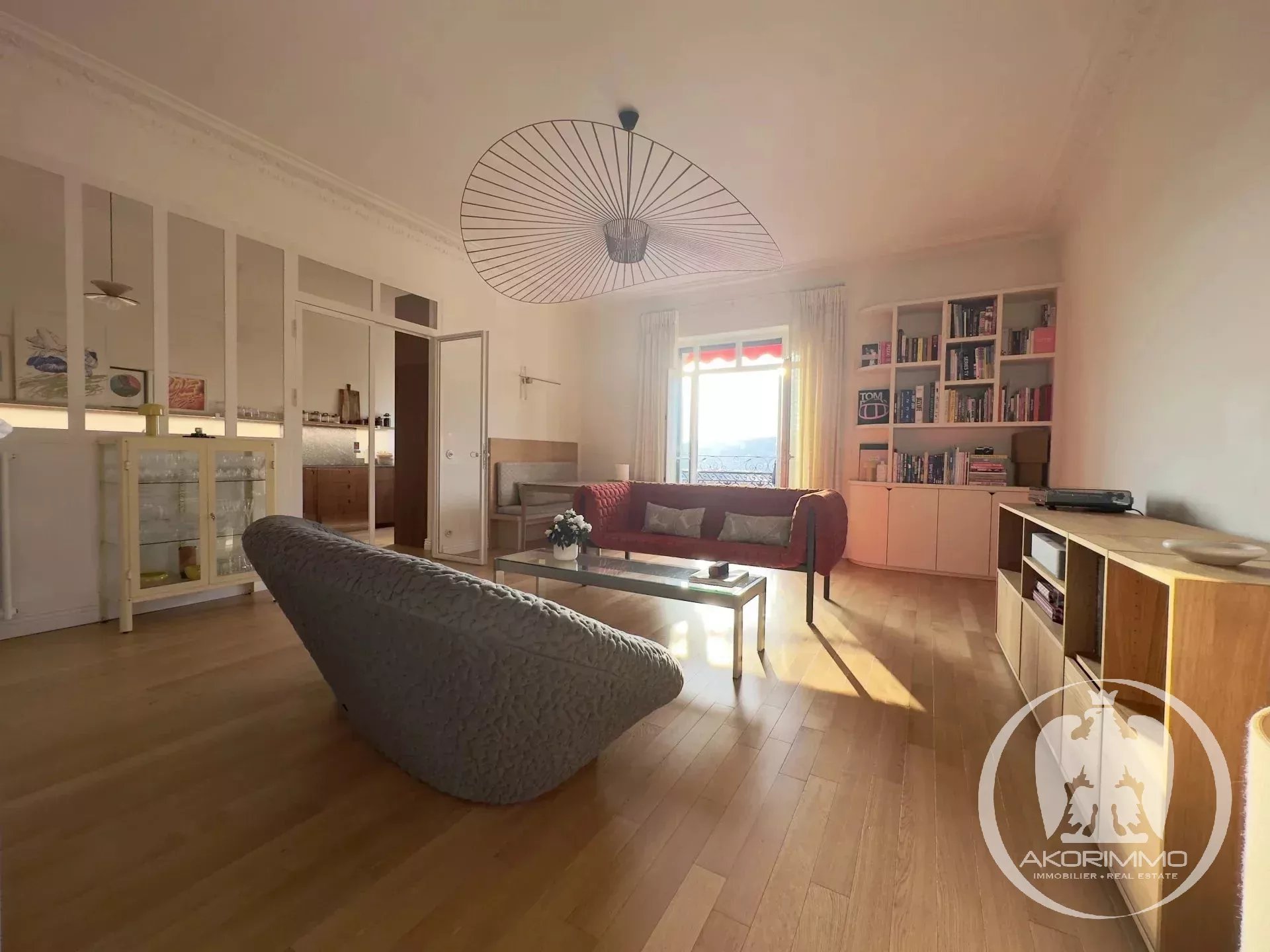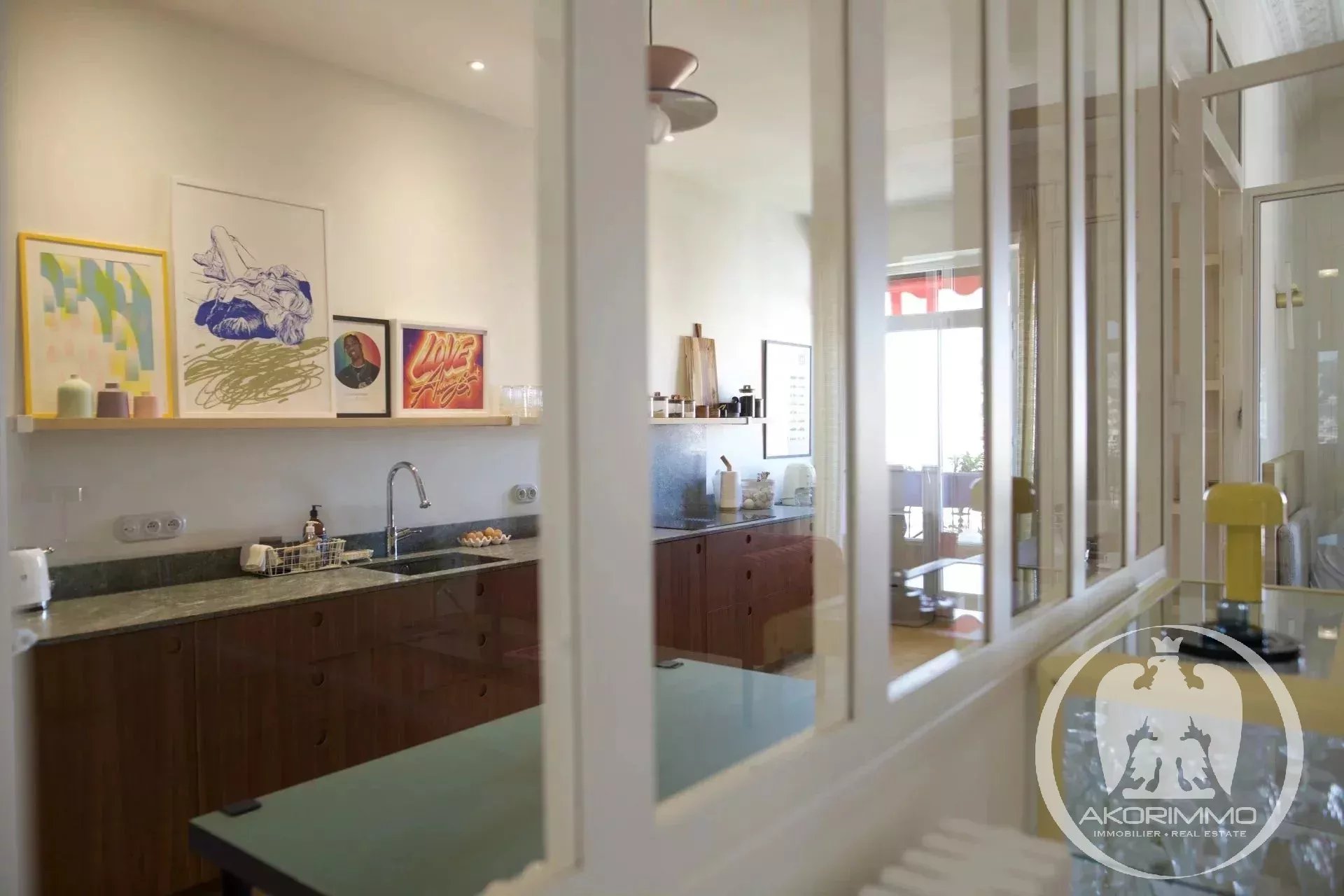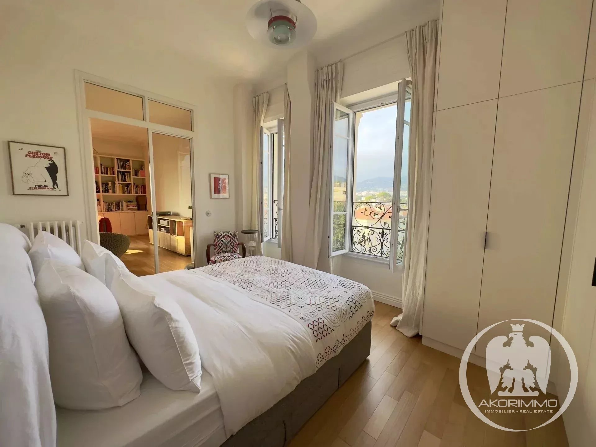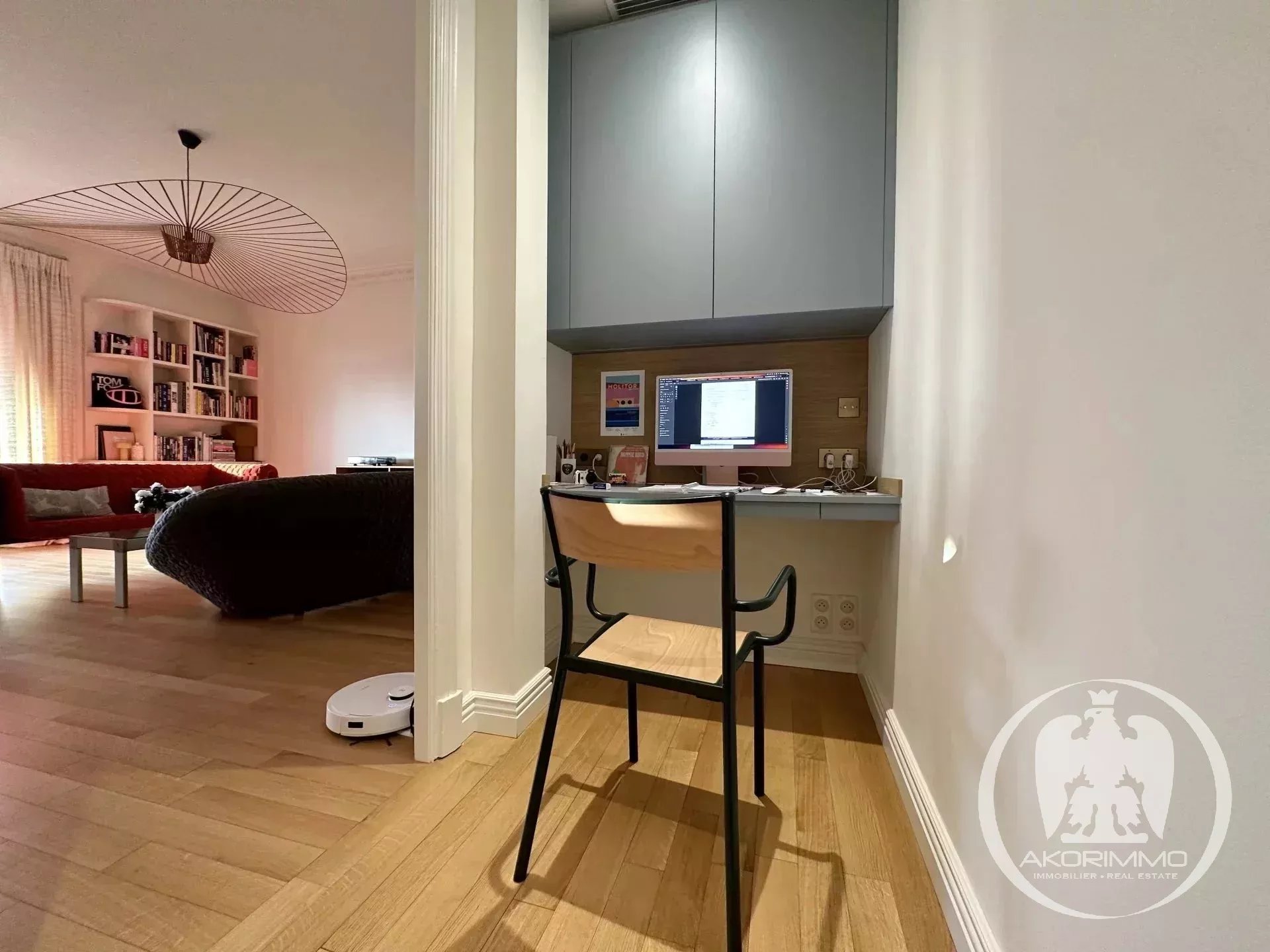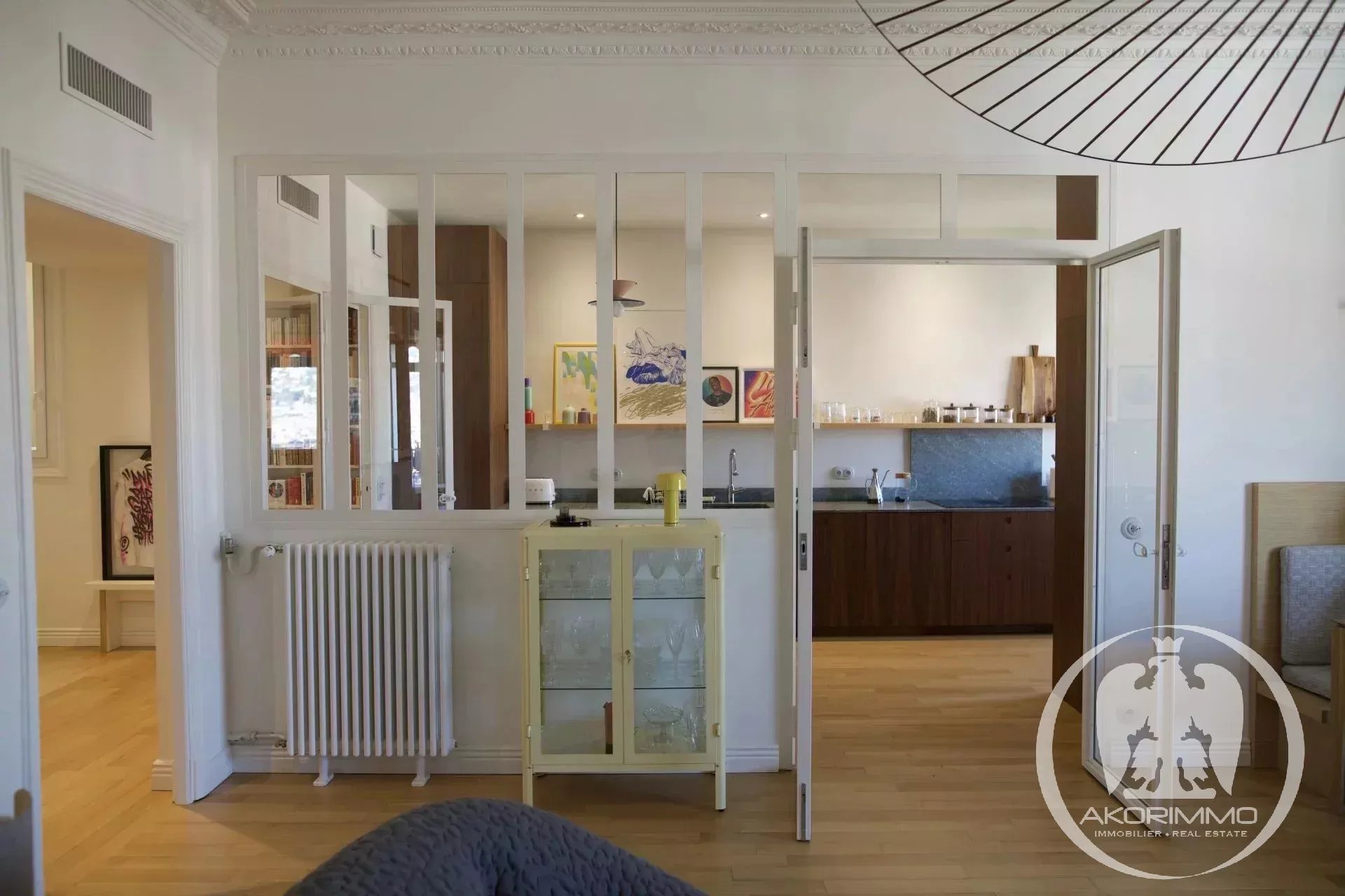 Appartement - 4 pièces - 129m² - rénové - 970.000 euros - A vendre Situé dans un des plus prestigieux palais de Nice, aux portes du centre ville, cet appartement vous séduira par sa rénovation de goût et son ambiance chaleureuse. Vous serez notamment charmé par ses volumes et sa luminosité. Le hall d'entrée aménagé se prolonge vers un coin nuit disposant de deux chambres exposées Est, dont une de 18,5m², comportant chacune un placard intégré. Une belle salle de bain familiale avec baignoire sabot et douche à l'italienne complète l'endroit. Le couloir mène également vers un vaste espace comprenant une pièce de vie avec son balcon, offrant une vue panoramique sur les toits de la ville, les collines et la mer. Une grande cuisine équipée et agrémentée d'un coin repas, fermée par une grande verrière, confère un sentiment d'espace et une luminosité maximale aux lieux. A partir du séjour vous accédez à une troisième chambre exposée Nord avec ses deux fenêtres et ses nombreux rangements. Un coin bureau a été aménagé dans le couloir et l'appartement dispose de toilettes séparés avec lave-main. Le bien a été rénové en 2021 avec l'aide d'un architecte d'intérieur. Les différents espaces ont été judicieusement optimisés à cette occasion avec de très nombreux rangements intégrés et sur mesure. Parquet massif dans toutes les pièces et matériaux de qualité équipent les lieux. En outre, une climatisation gainée à été intégrée dans les travaux ce qui s'ajoute au confort de ce magnifique appartement.