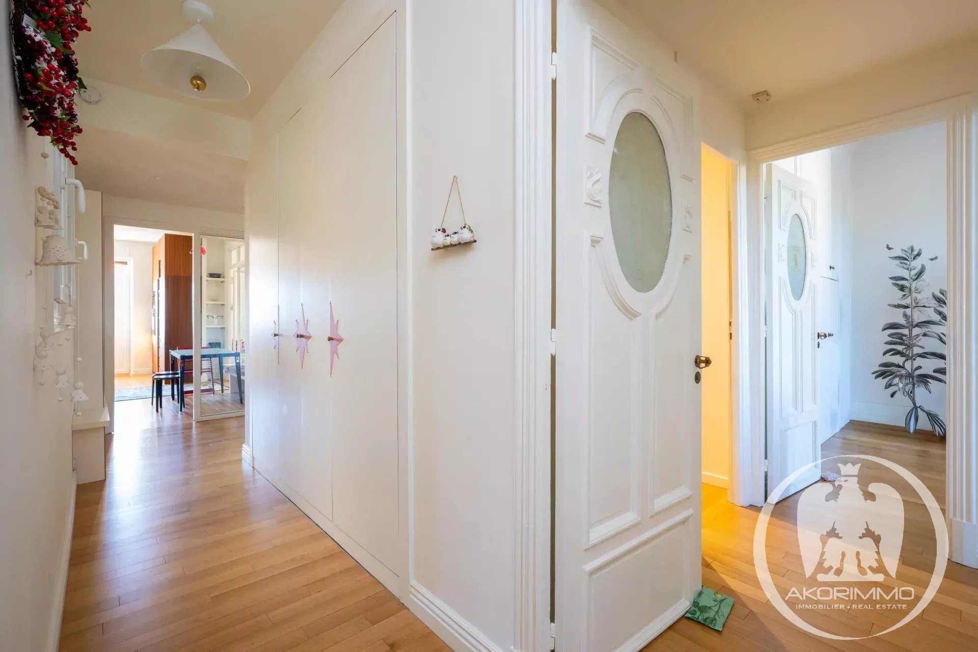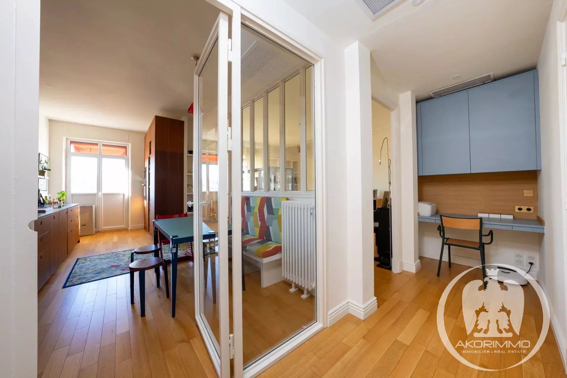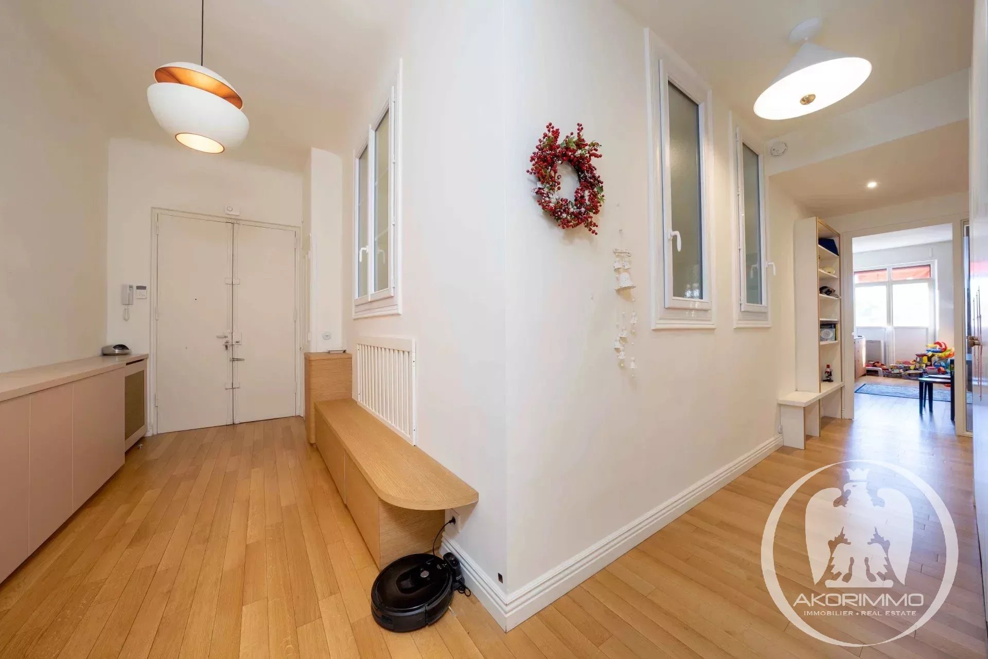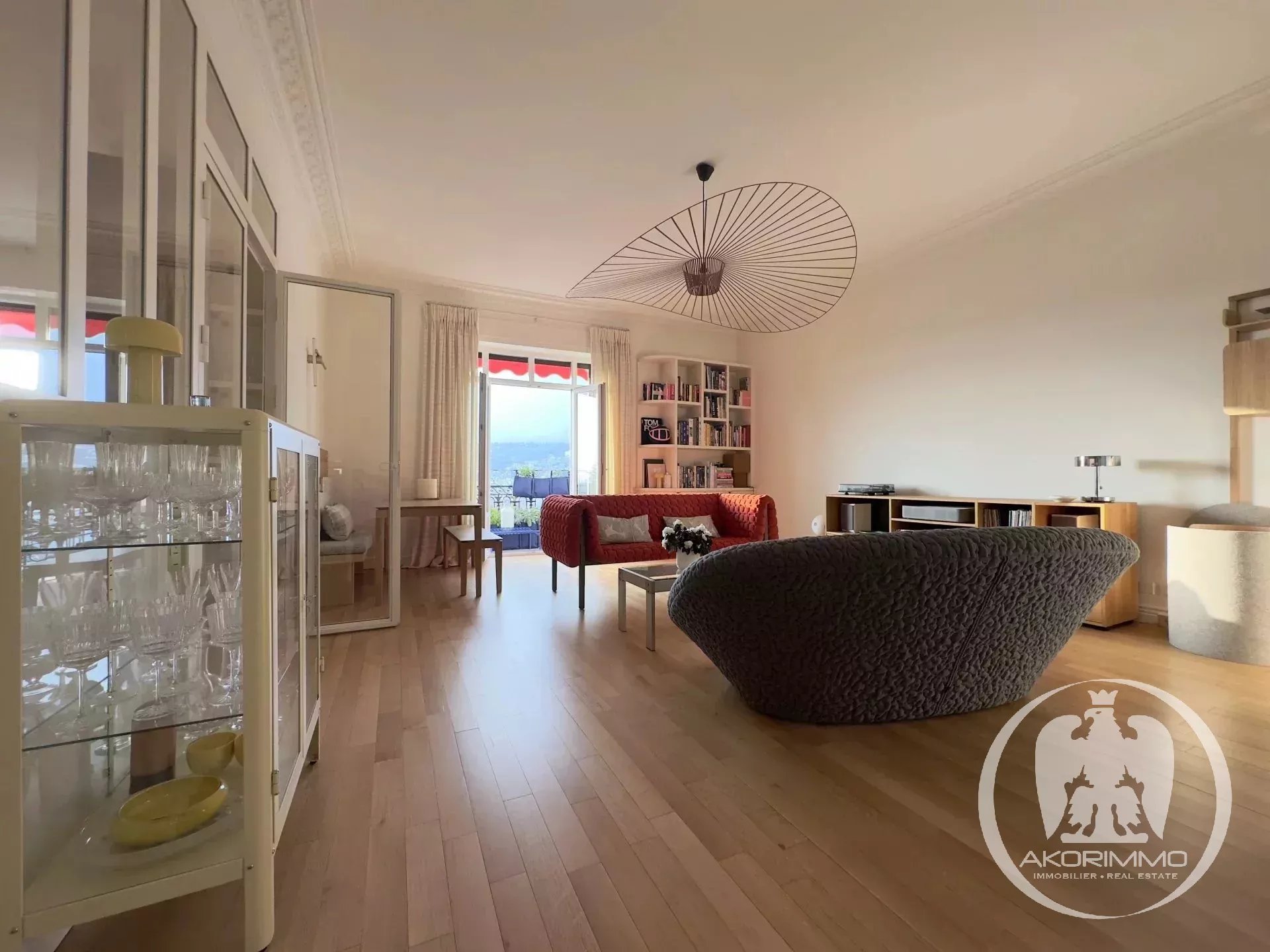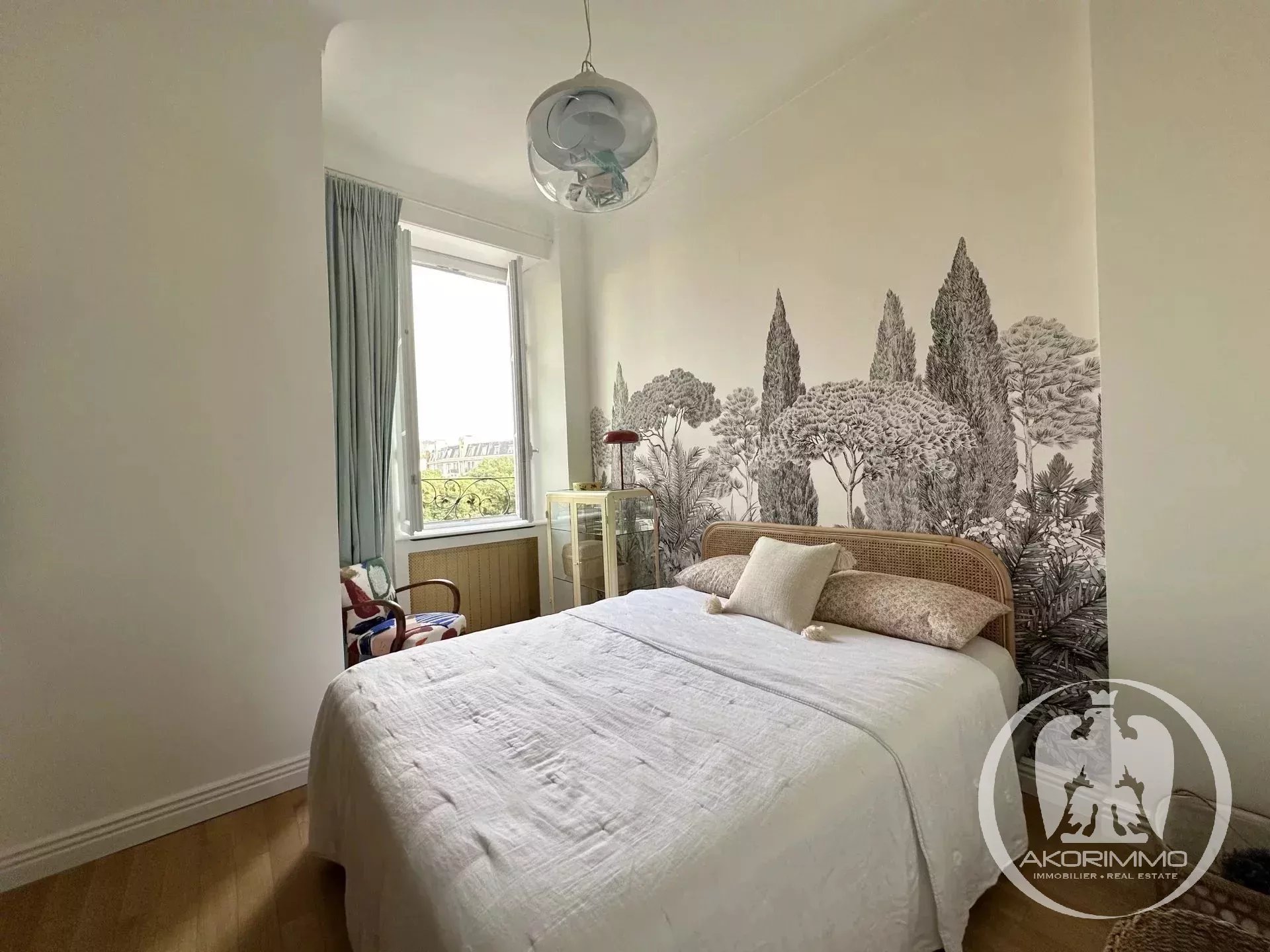 Appartement - 4 pièces - 129m² - rénové - 970.000 euros - A vendre Situé dans un des plus prestigieux palais de Nice, aux portes du centre ville, cet appartement vous séduira par sa rénovation de goût et son ambiance chaleureuse. Vous serez notamment charmé par ses volumes et sa luminosité. Le hall d'entrée aménagé se prolonge vers un coin nuit disposant de deux chambres exposées Est, dont une de 18,5m², comportant chacune un placard intégré. Une belle salle de bain familiale avec baignoire sabot et douche à l'italienne complète l'endroit. Le couloir mène également vers un vaste espace comprenant une pièce de vie avec son balcon, offrant une vue panoramique sur les toits de la ville, les collines et la mer. Une grande cuisine équipée et agrémentée d'un coin repas, fermée par une grande verrière, confère un sentiment d'espace et une luminosité maximale aux lieux. A partir du séjour vous accédez à une troisième chambre exposée Nord avec ses deux fenêtres et ses nombreux rangements. Un coin bureau a été aménagé dans le couloir et l'appartement dispose de toilettes séparés avec lave-main. Le bien a été rénové en 2021 avec l'aide d'un architecte d'intérieur. Les différents espaces ont été judicieusement optimisés à cette occasion avec de très nombreux rangements intégrés et sur mesure. Parquet massif dans toutes les pièces et matériaux de qualité équipent les lieux. En outre, une climatisation gainée à été intégrée dans les travaux ce qui s'ajoute au confort de ce magnifique appartement.