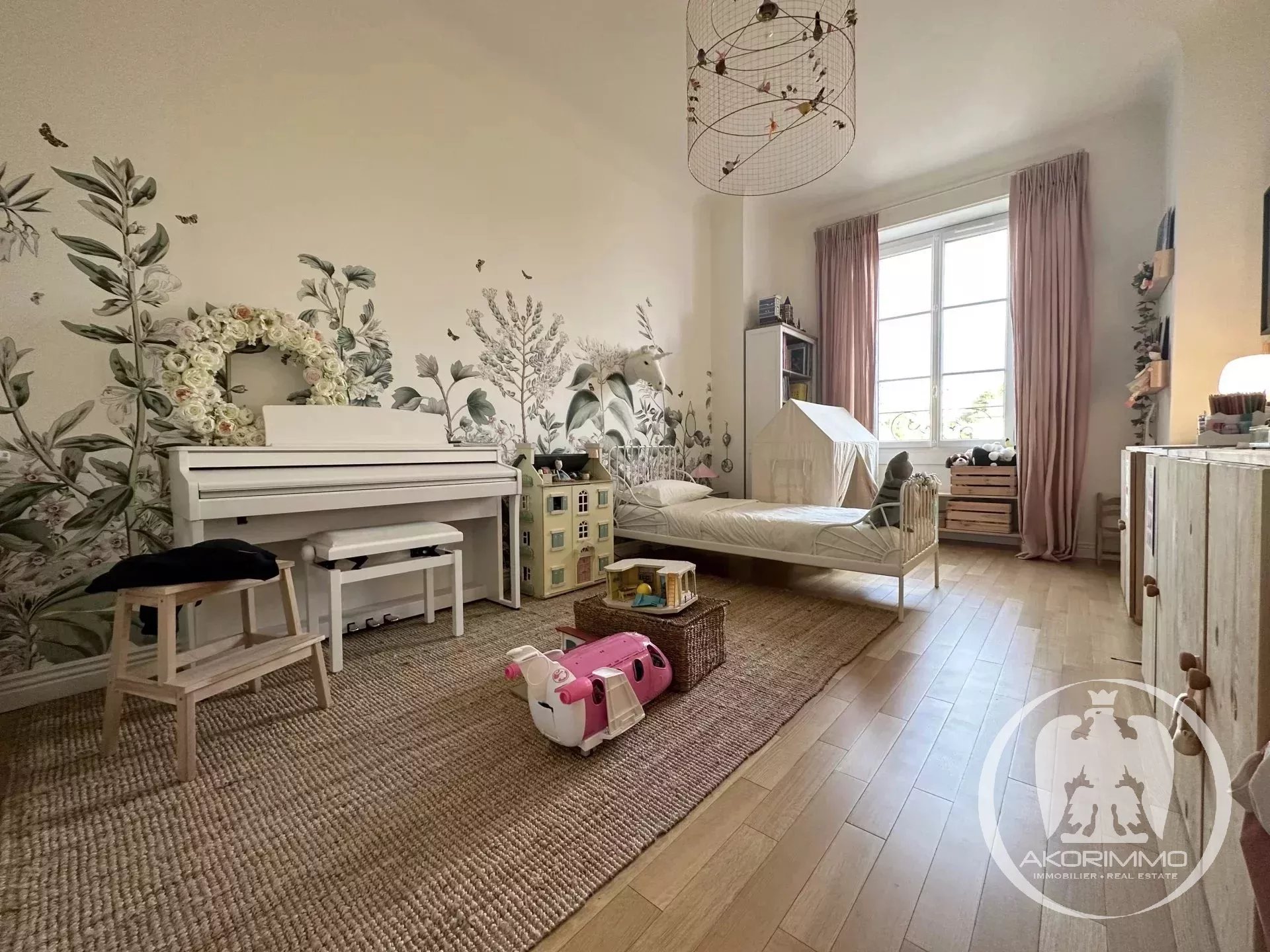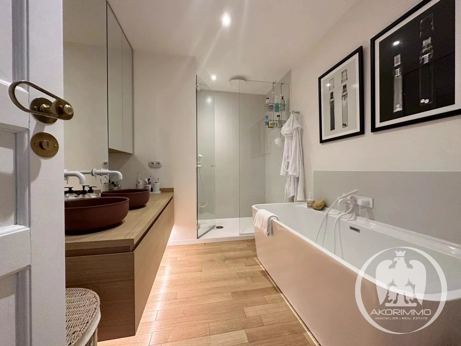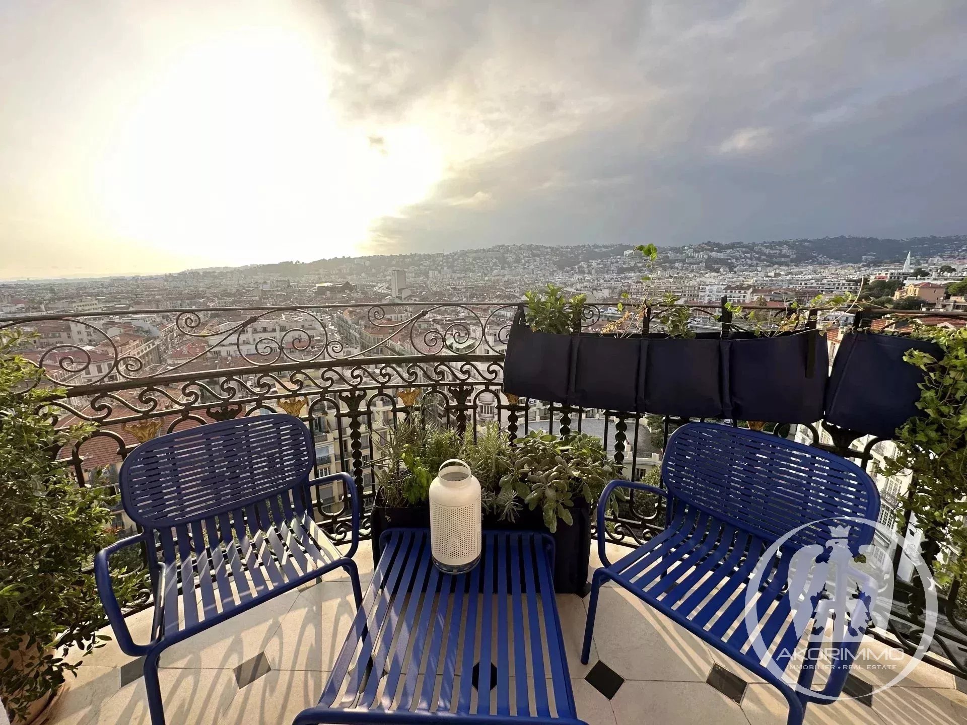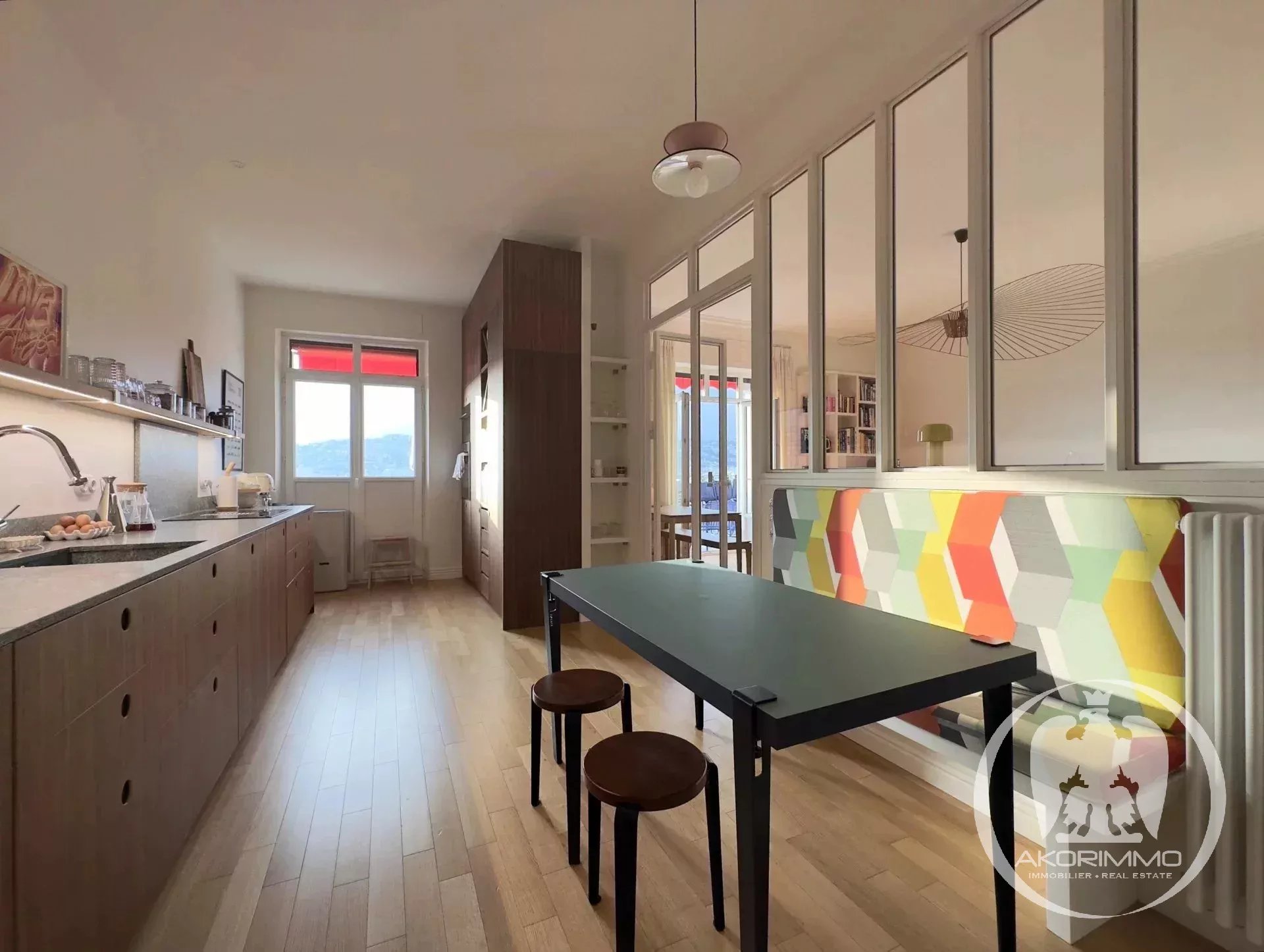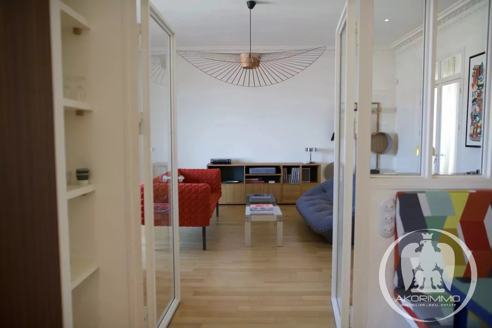 Appartement - 4 pièces - 129m² - rénové - 970.000 euros - A vendre Situé dans un des plus prestigieux palais de Nice, aux portes du centre ville, cet appartement vous séduira par sa rénovation de goût et son ambiance chaleureuse. Vous serez notamment charmé par ses volumes et sa luminosité. Le hall d'entrée aménagé se prolonge vers un coin nuit disposant de deux chambres exposées Est, dont une de 18,5m², comportant chacune un placard intégré. Une belle salle de bain familiale avec baignoire sabot et douche à l'italienne complète l'endroit. Le couloir mène également vers un vaste espace comprenant une pièce de vie avec son balcon, offrant une vue panoramique sur les toits de la ville, les collines et la mer. Une grande cuisine équipée et agrémentée d'un coin repas, fermée par une grande verrière, confère un sentiment d'espace et une luminosité maximale aux lieux. A partir du séjour vous accédez à une troisième chambre exposée Nord avec ses deux fenêtres et ses nombreux rangements. Un coin bureau a été aménagé dans le couloir et l'appartement dispose de toilettes séparés avec lave-main. Le bien a été rénové en 2021 avec l'aide d'un architecte d'intérieur. Les différents espaces ont été judicieusement optimisés à cette occasion avec de très nombreux rangements intégrés et sur mesure. Parquet massif dans toutes les pièces et matériaux de qualité équipent les lieux. En outre, une climatisation gainée à été intégrée dans les travaux ce qui s'ajoute au confort de ce magnifique appartement.