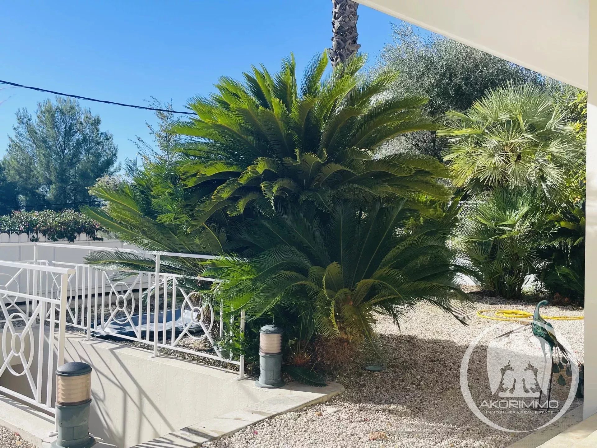 Joli terrain complanté de palmiers, agrémenté d'une terrasse de 30 m2, d'un abri de jardin, d'un garage fermé de 22 m2.